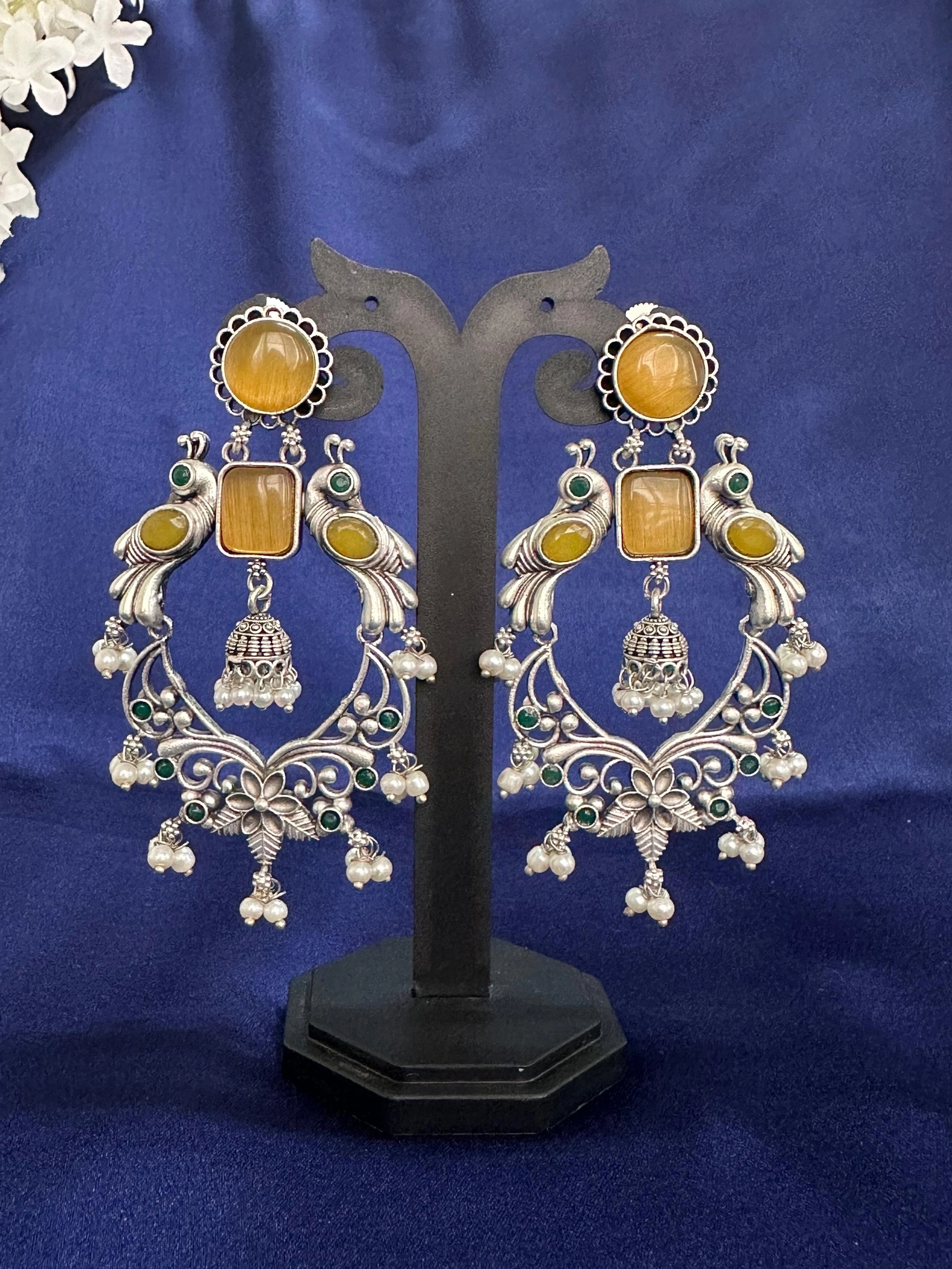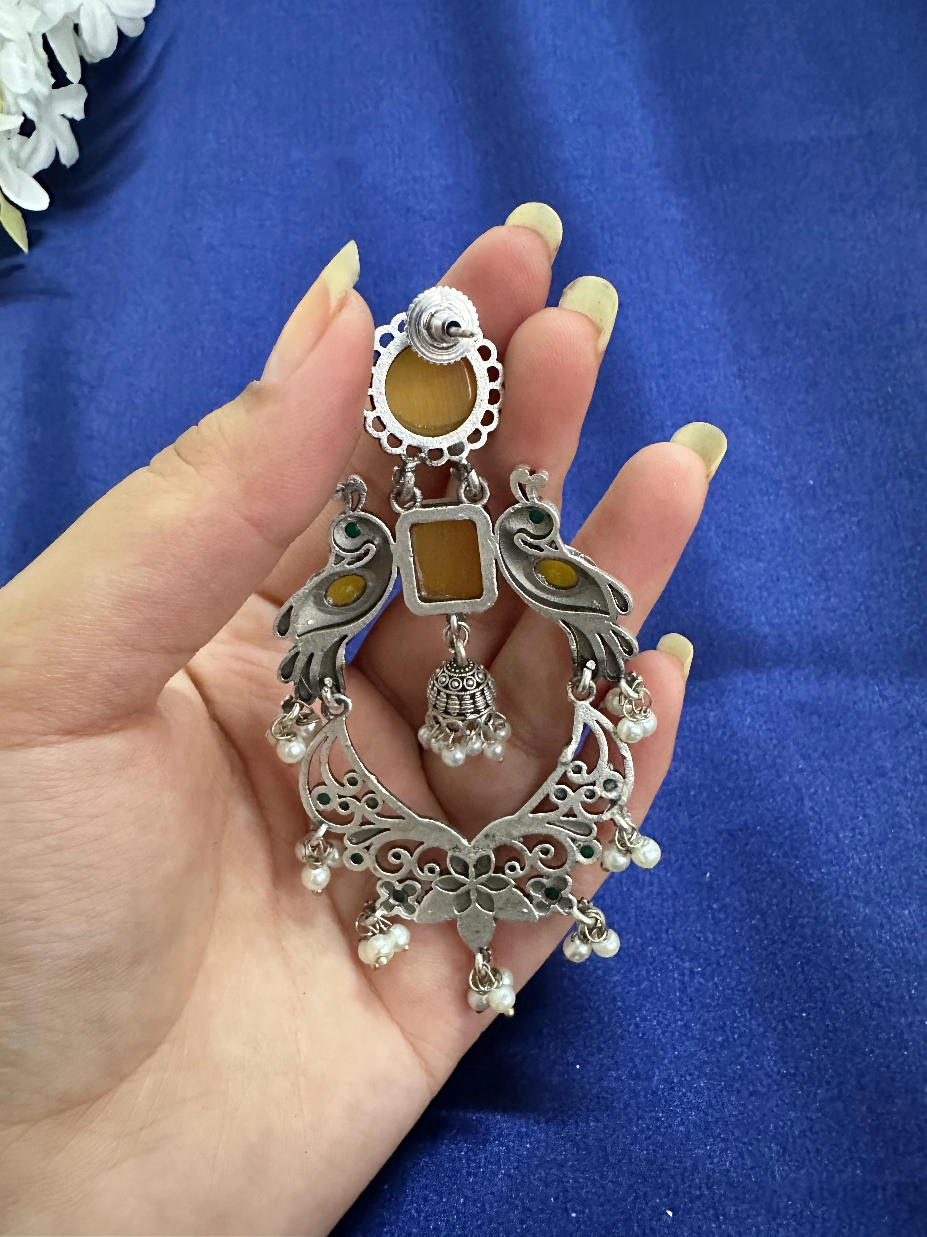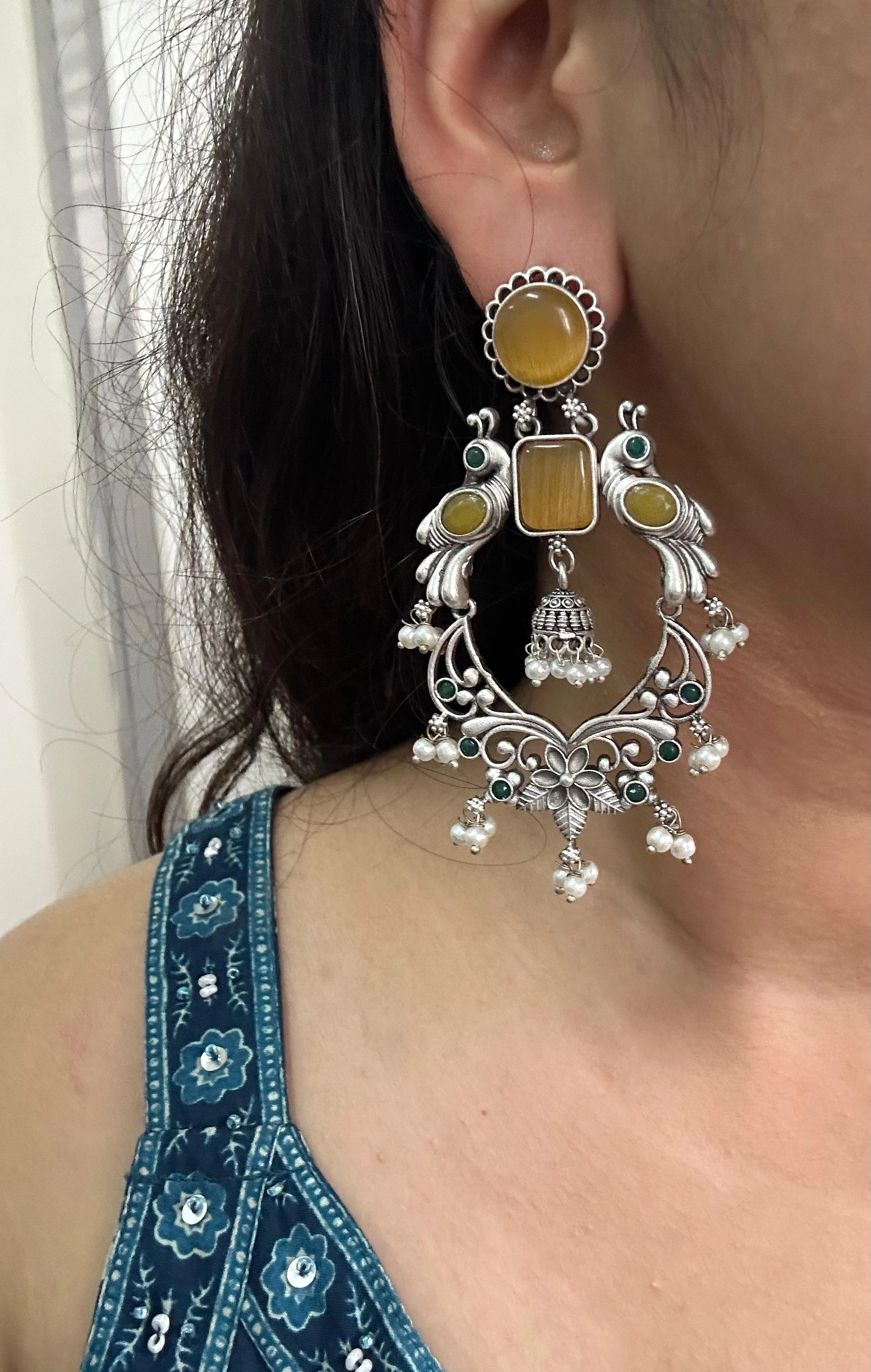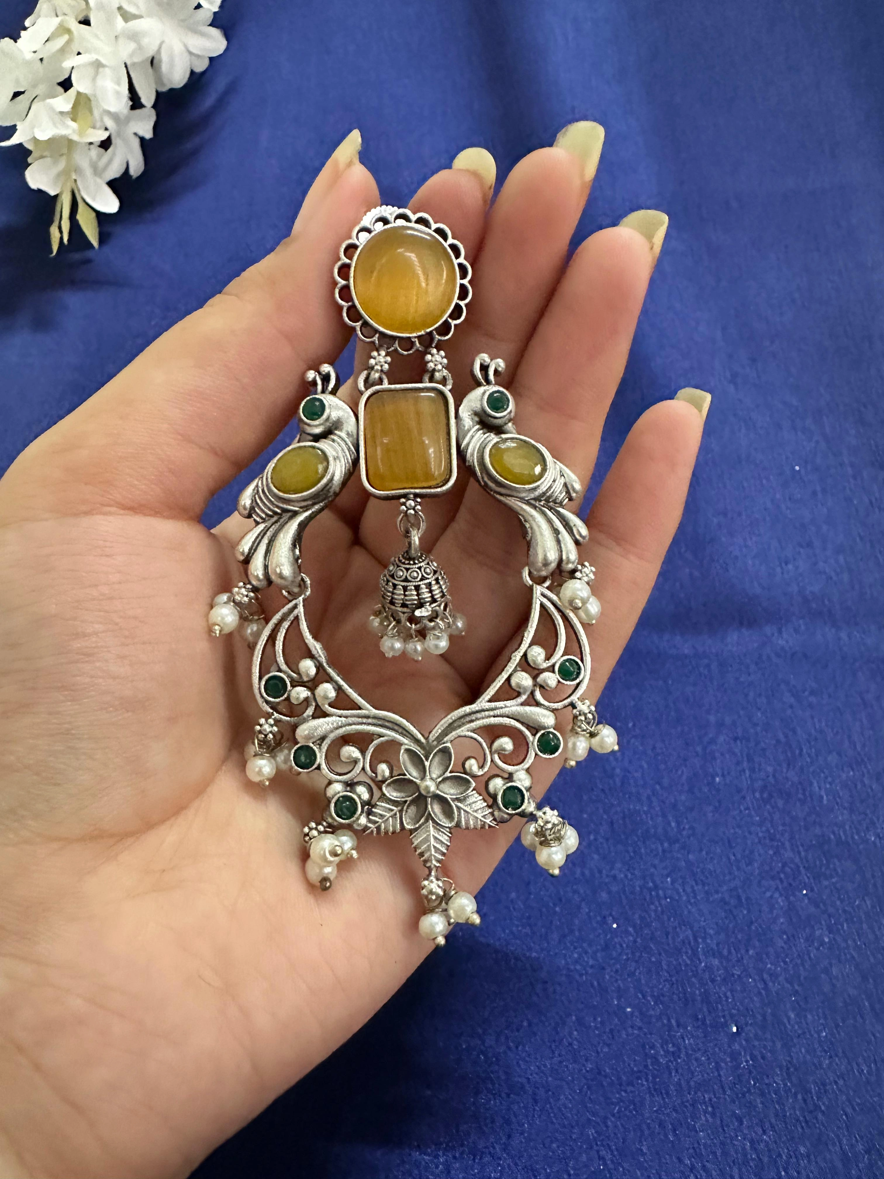 Majestic Peacock Yellow Stone Chandbali Jhumka Earrings