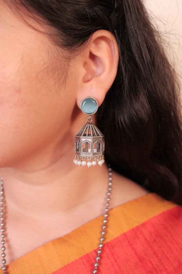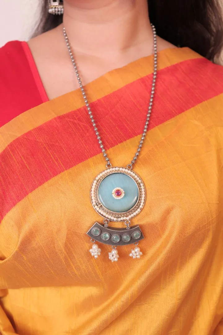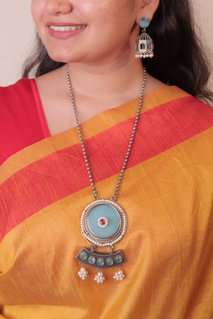 Blue Stone with Silver Bead Necklace and earing