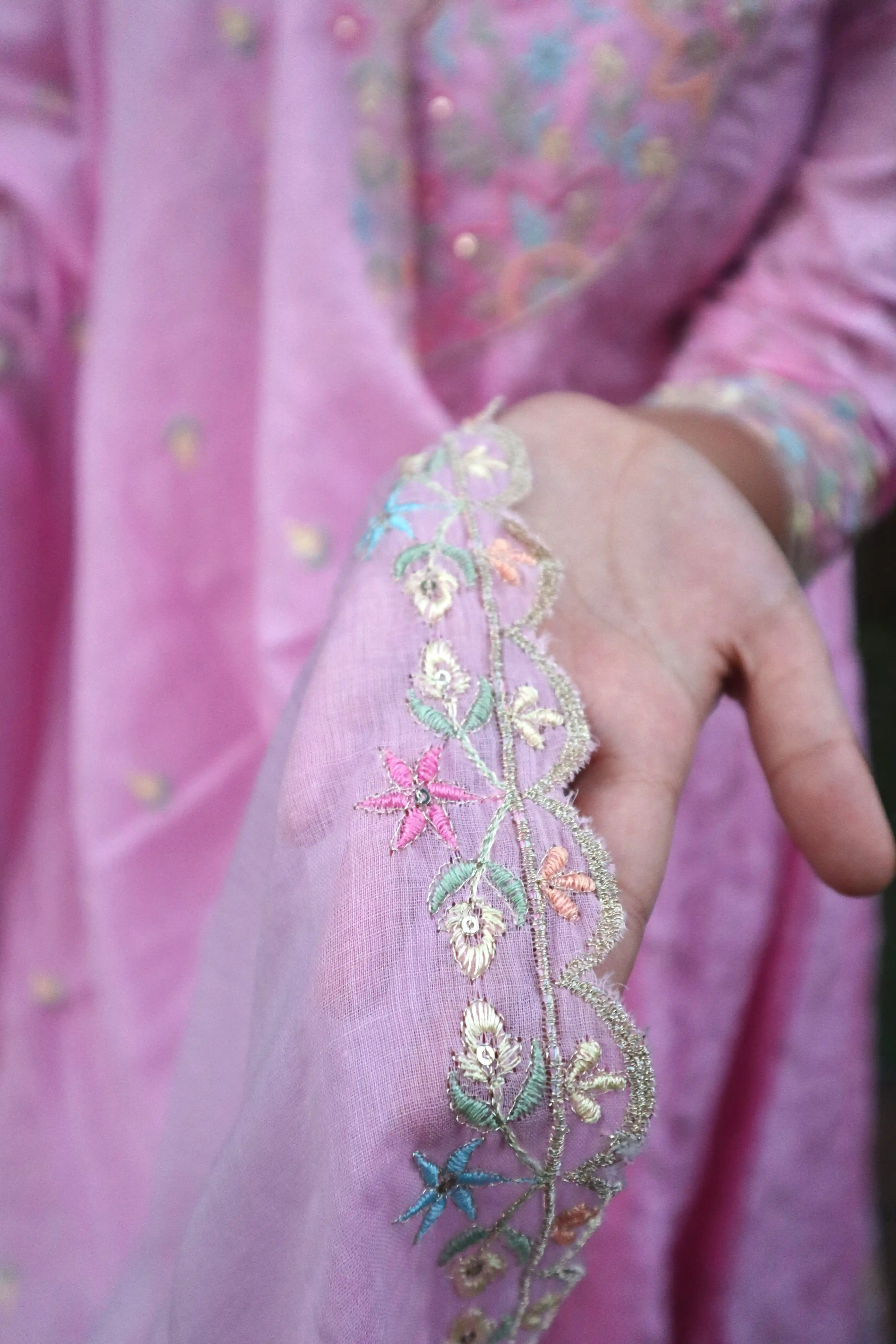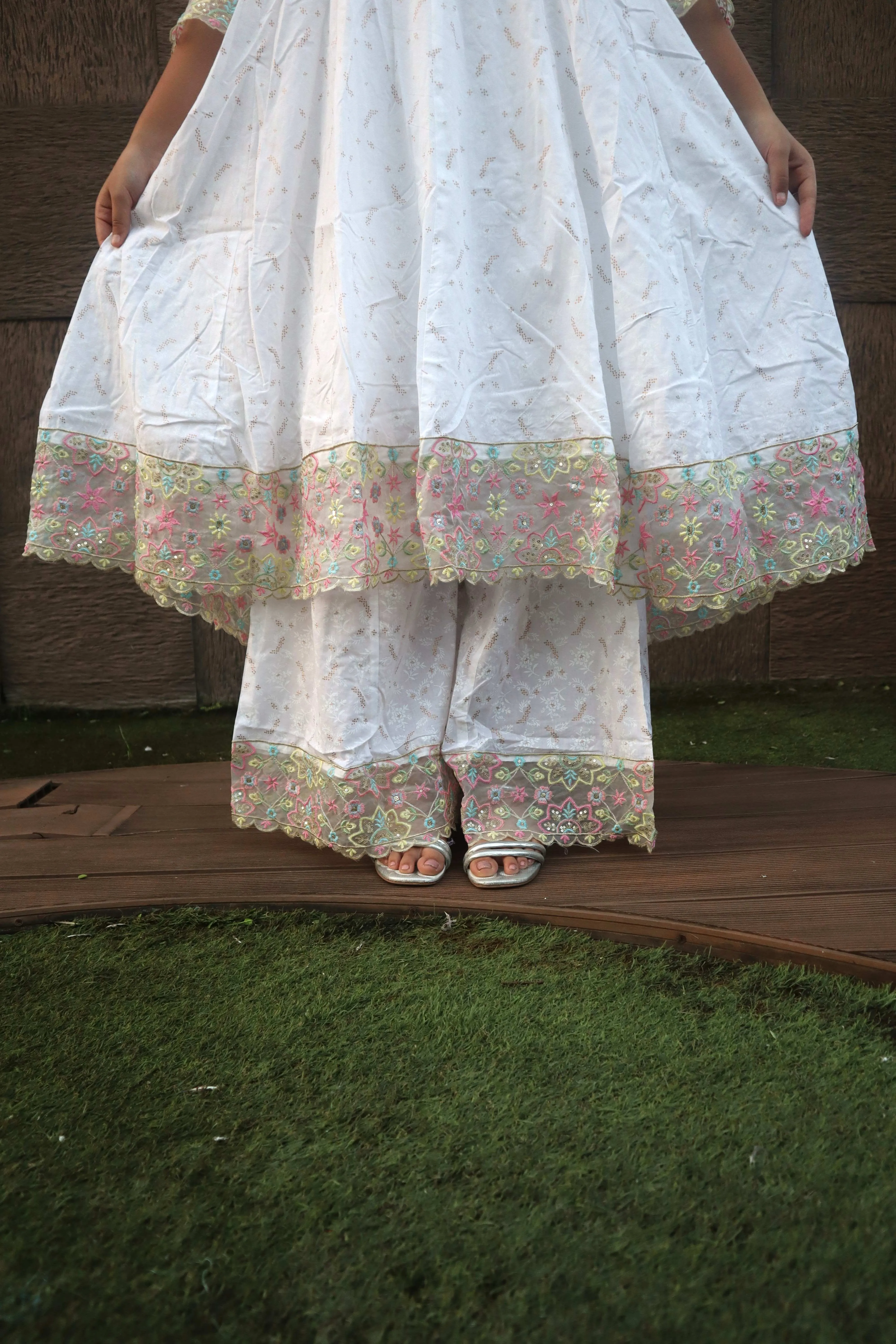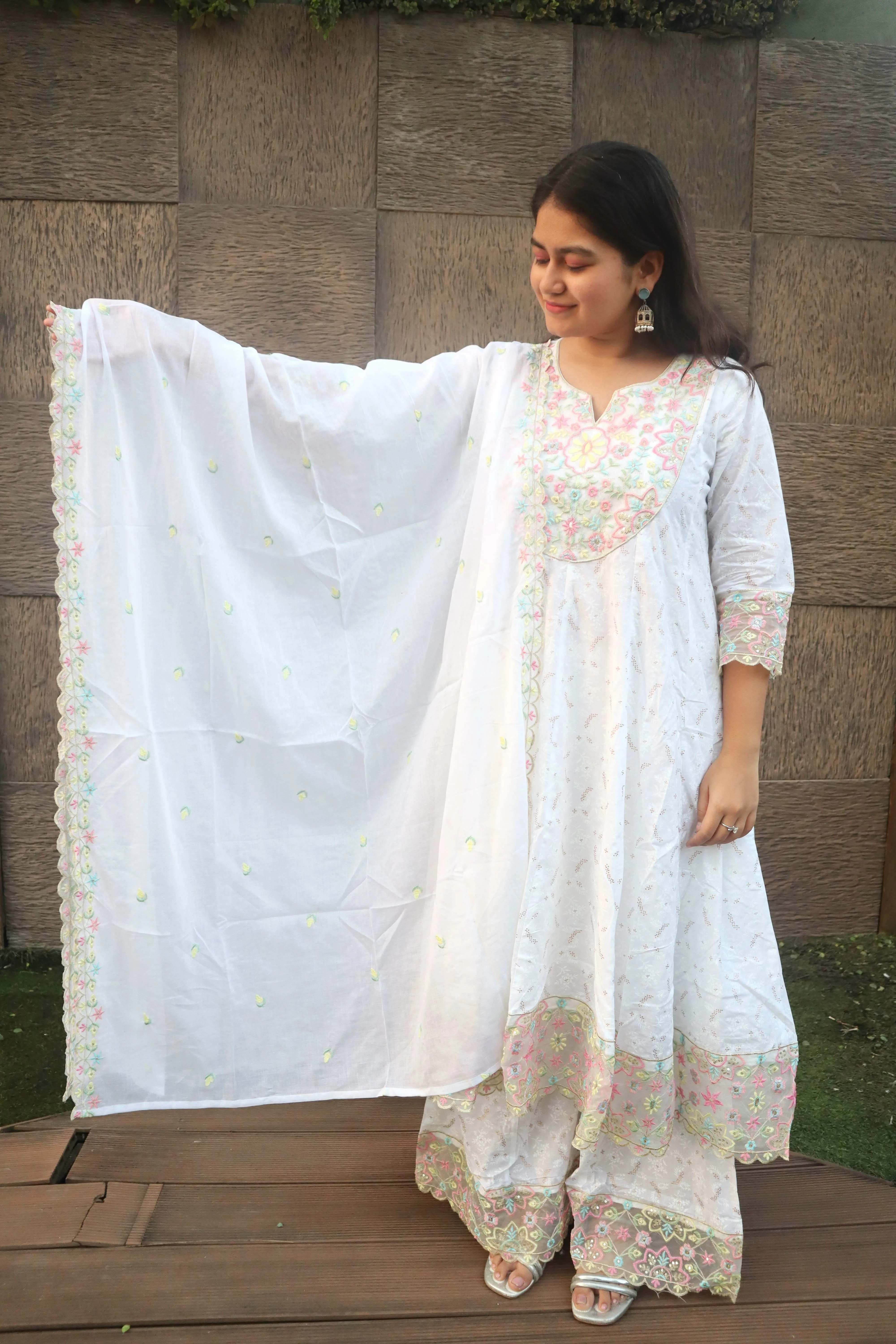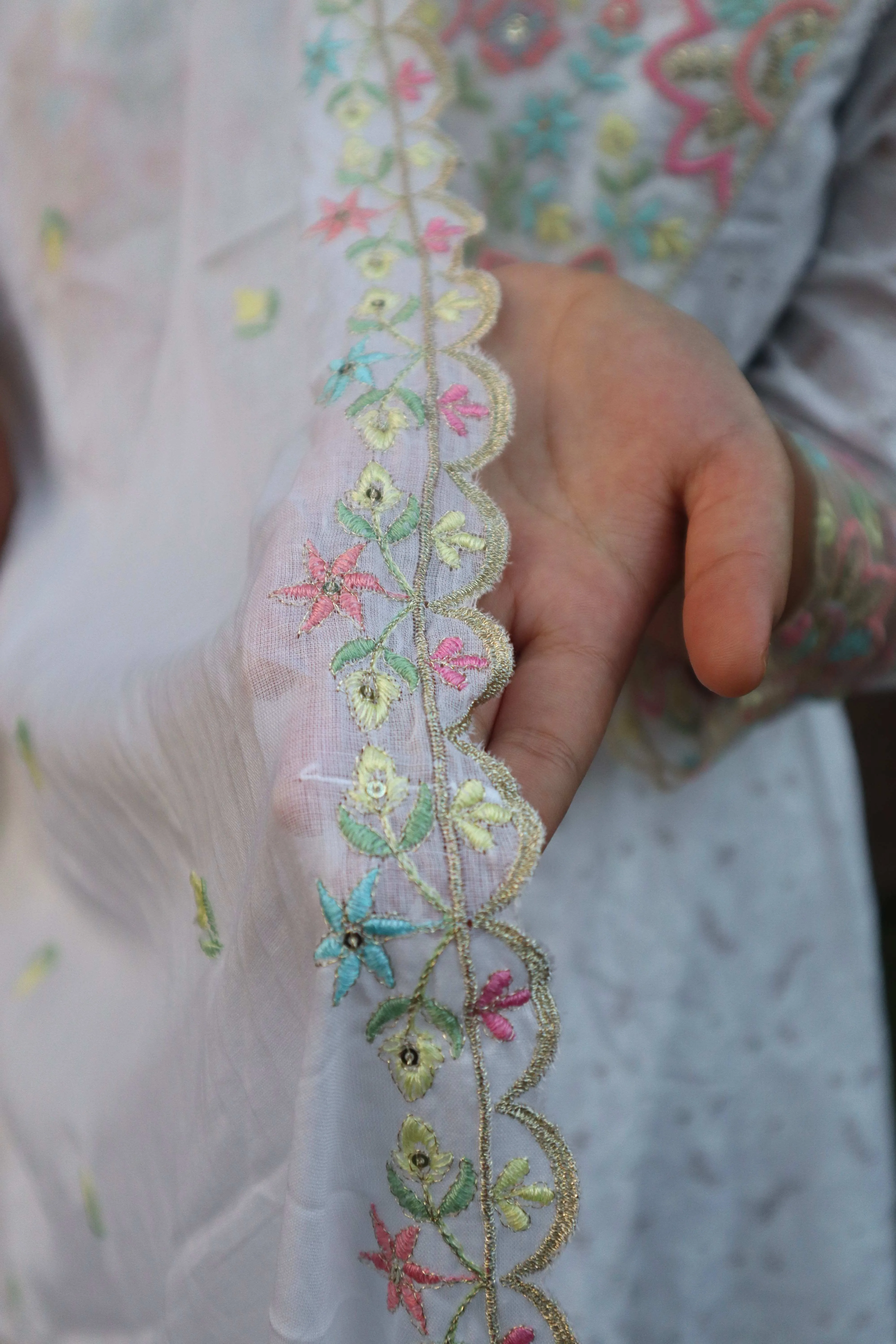Material <p><strong>Kurta Fabric:</strong> Pure Georgette .</p><p><strong>Kurta Style:</strong> Kalidar.</p><p><strong>Lining Material:</strong> Shantoon or fine cotton.</p><p><strong>Embroidery Style:</strong> Hand-Embroidered Chikankari.</p><p><strong>Threadwork Color:</strong> Pastel Resham (multi-color).</p><p><strong>Embroidery Density:</strong> Heavy Jaal work.</p><p><strong>Dupatta Fabric:</strong> Sheer Chiffon/Net.</p><p><strong>Dupatta Finish:</strong> Scalloped border.</p><p><strong>Pants Fabric:</strong> Soft Silk Blend.</p>