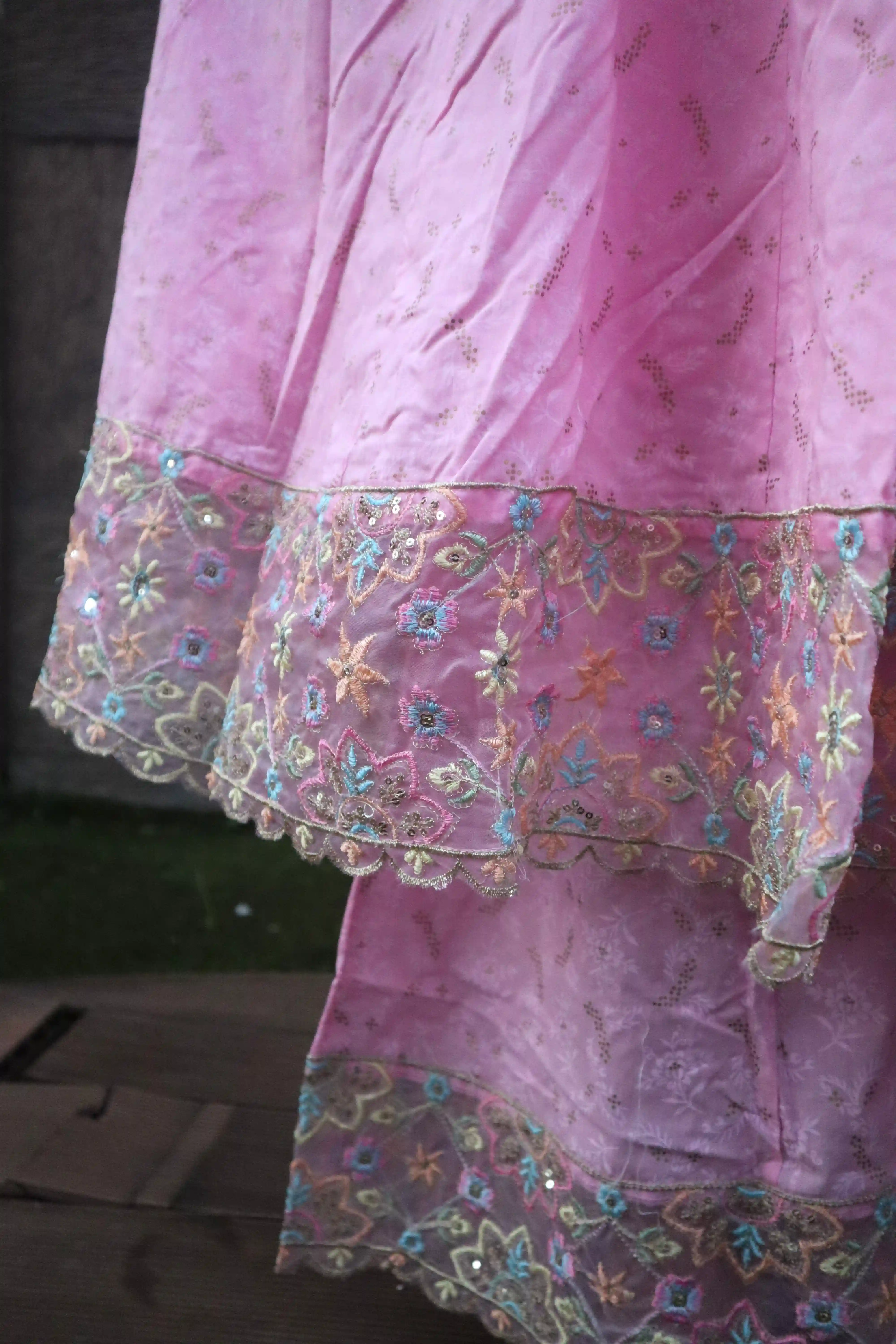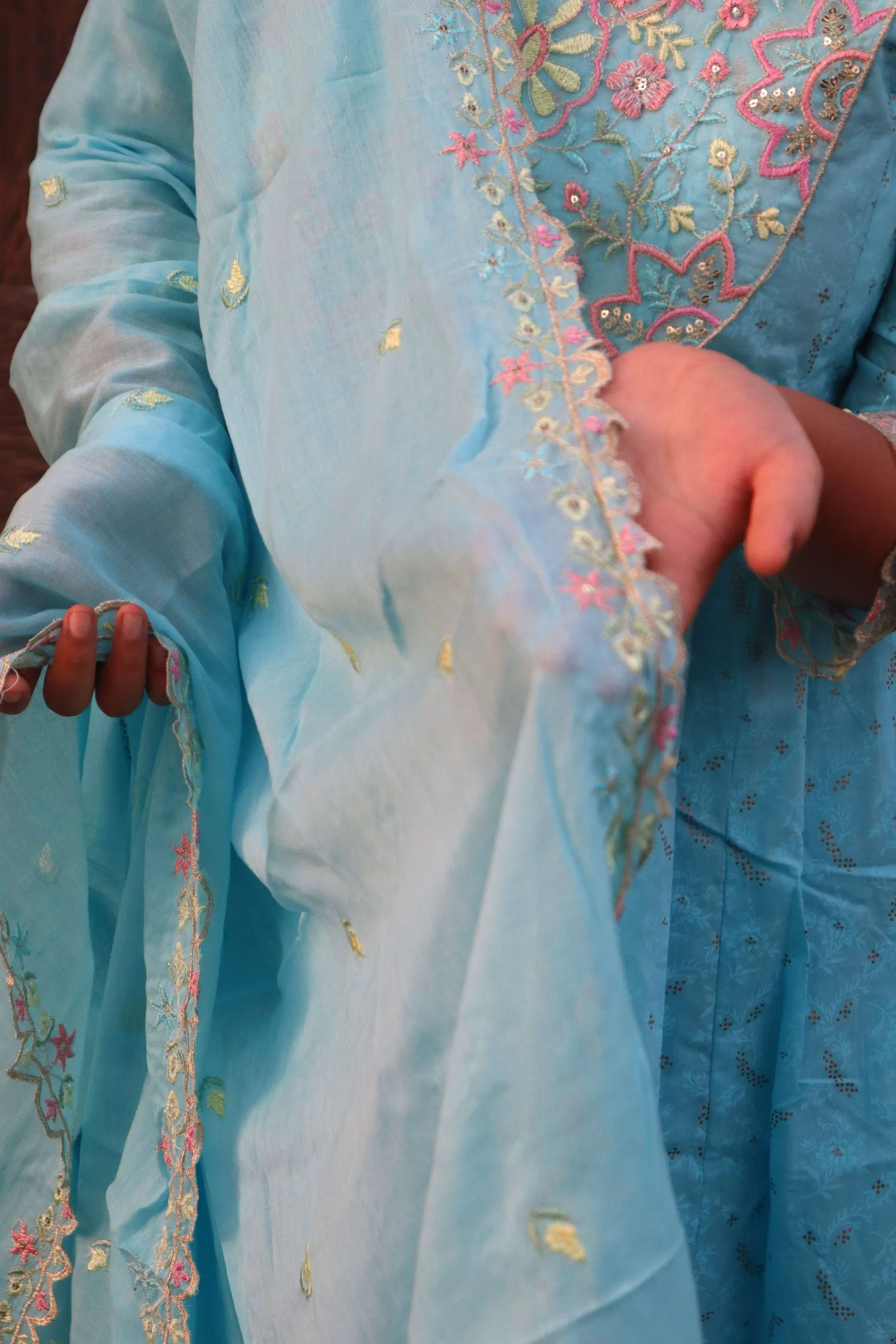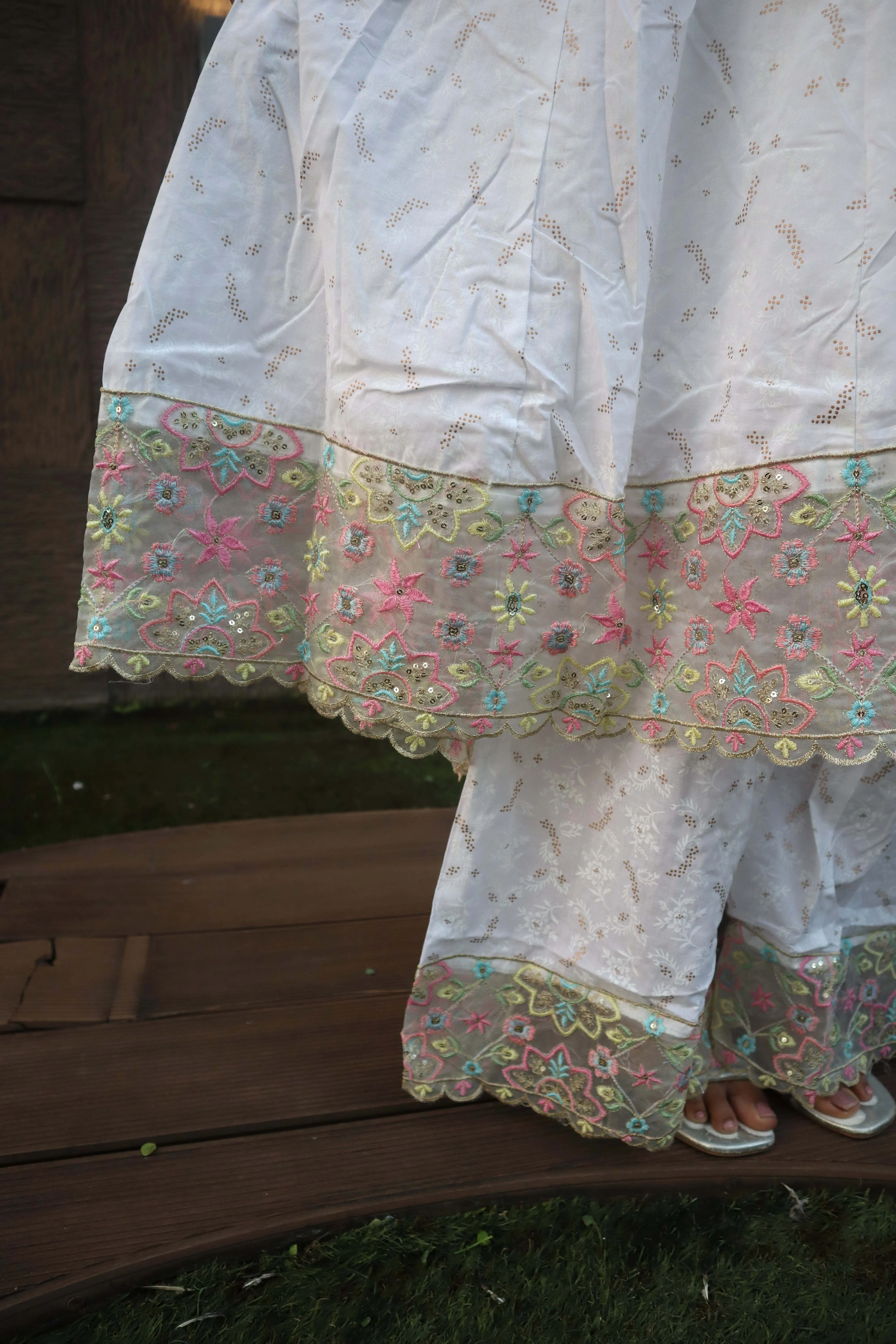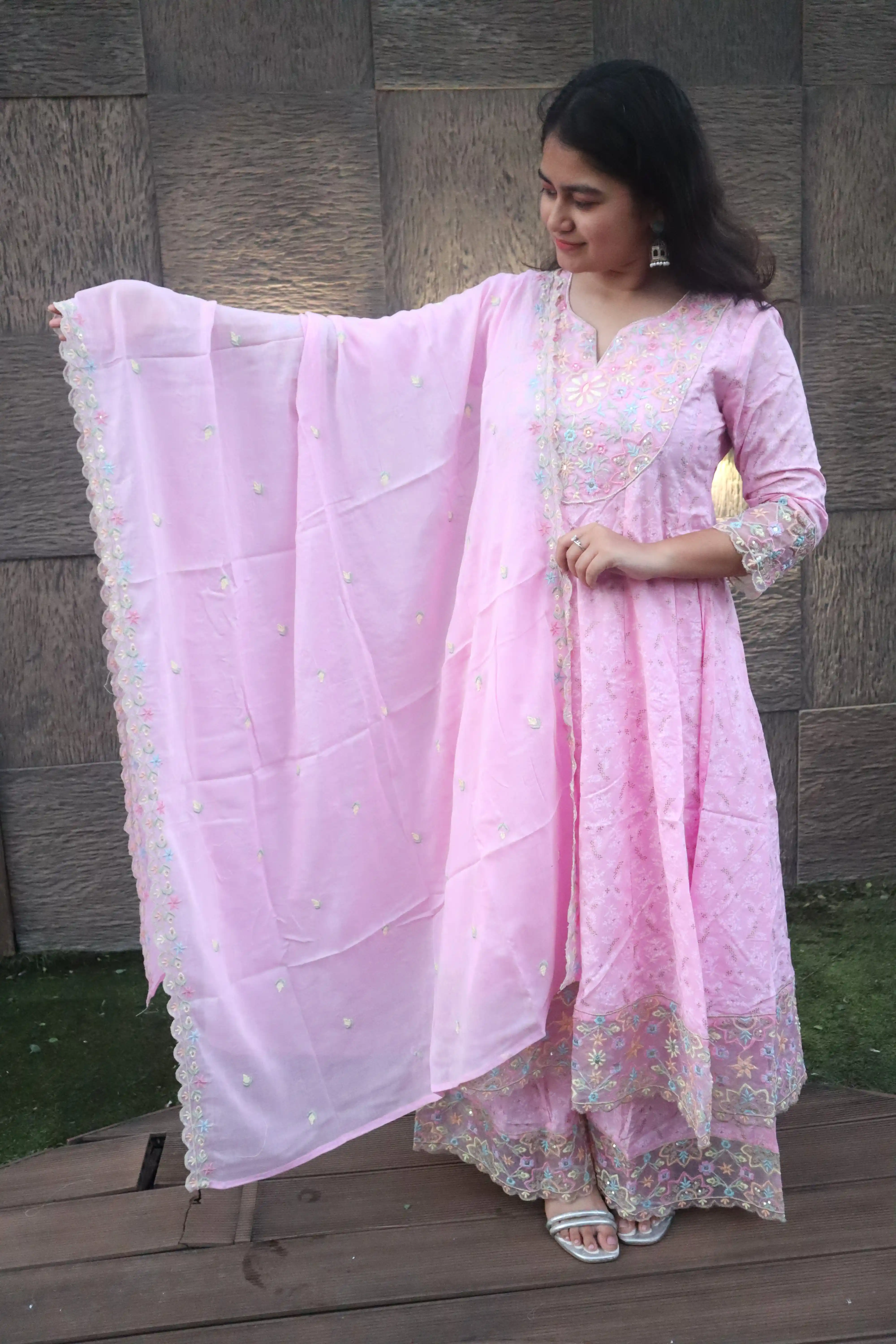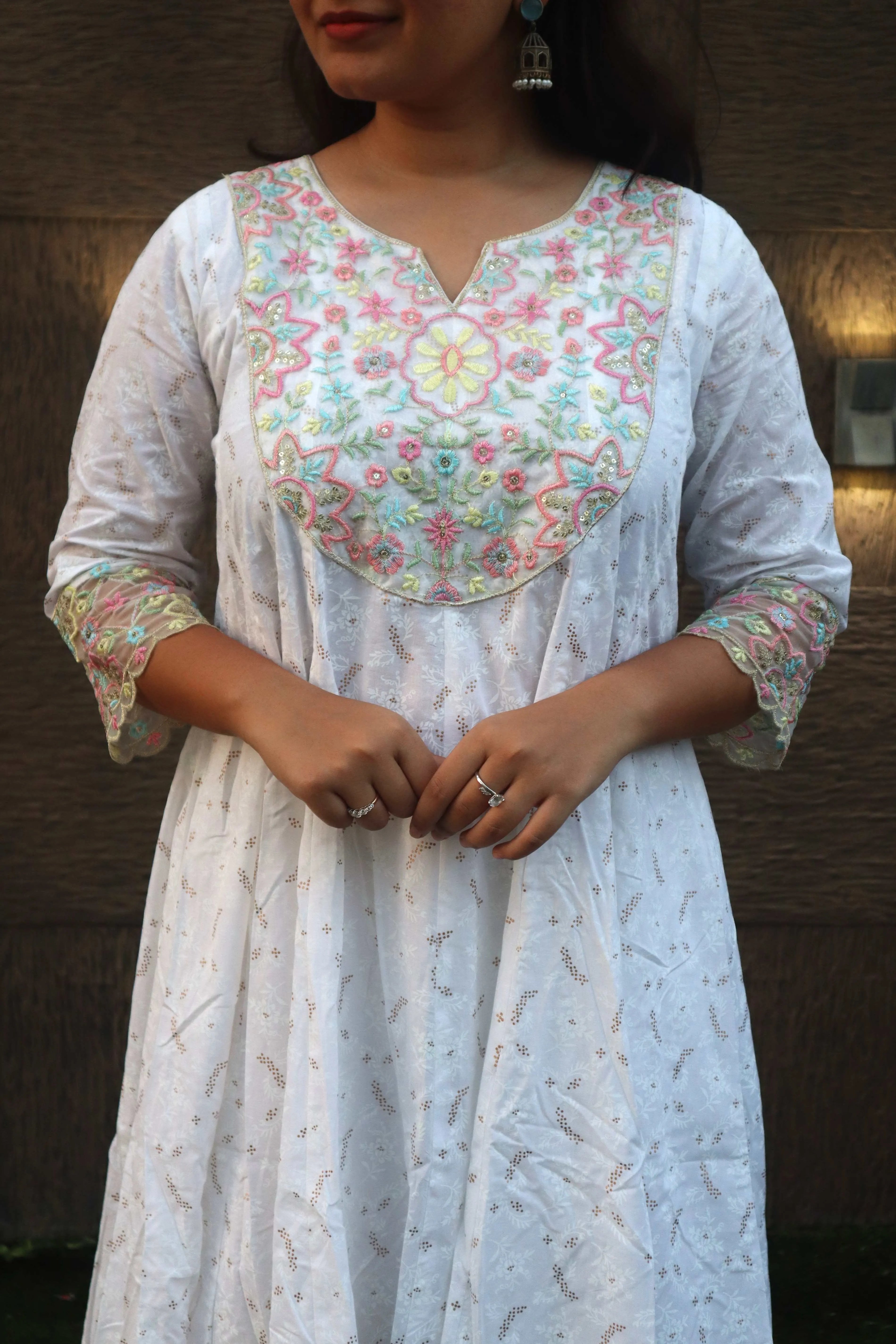 Material <p><strong>Kurta Fabric:</strong> Pure Georgette .</p><p><strong>Kurta Style:</strong> Kalidar.</p><p><strong>Lining Material:</strong> Shantoon or fine cotton.</p><p><strong>Embroidery Style:</strong> Hand-Embroidered Chikankari.</p><p><strong>Threadwork Color:</strong> Pastel Resham (multi-color).</p><p><strong>Embroidery Density:</strong> Heavy Jaal work.</p><p><strong>Dupatta Fabric:</strong> Sheer Chiffon/Net.</p><p><strong>Dupatta Finish:</strong> Scalloped border.</p><p><strong>Pants Fabric:</strong> Soft Silk Blend.</p>