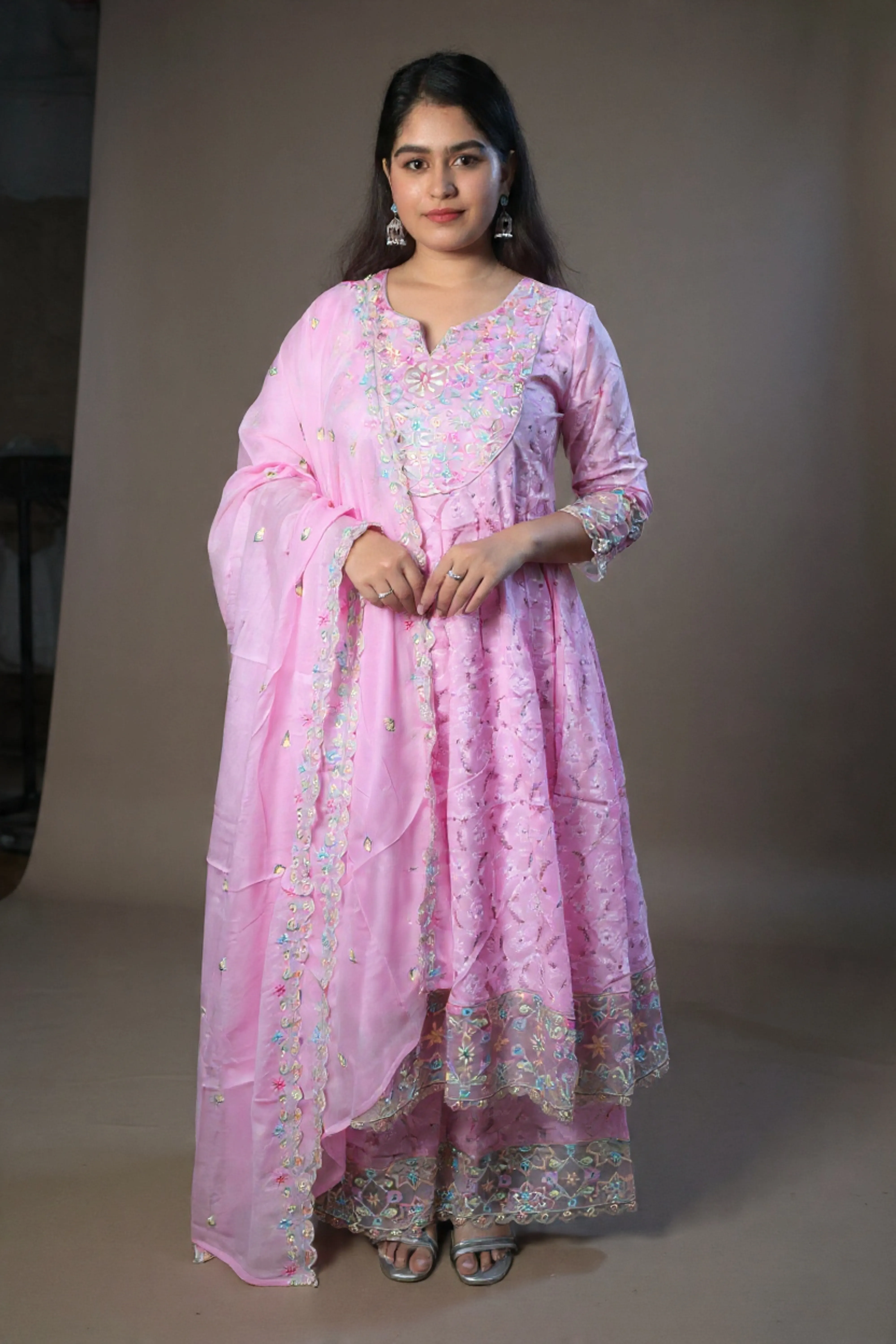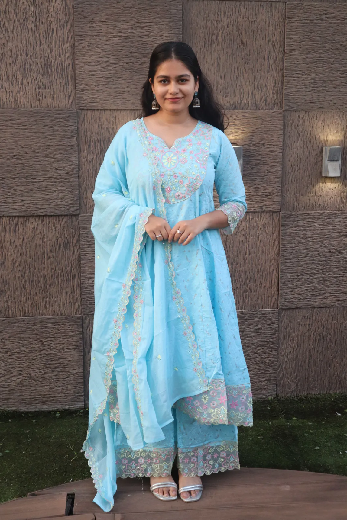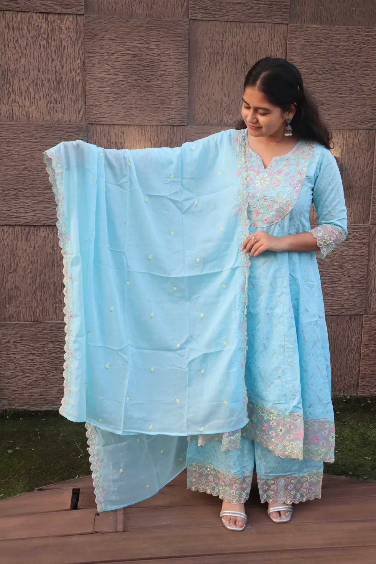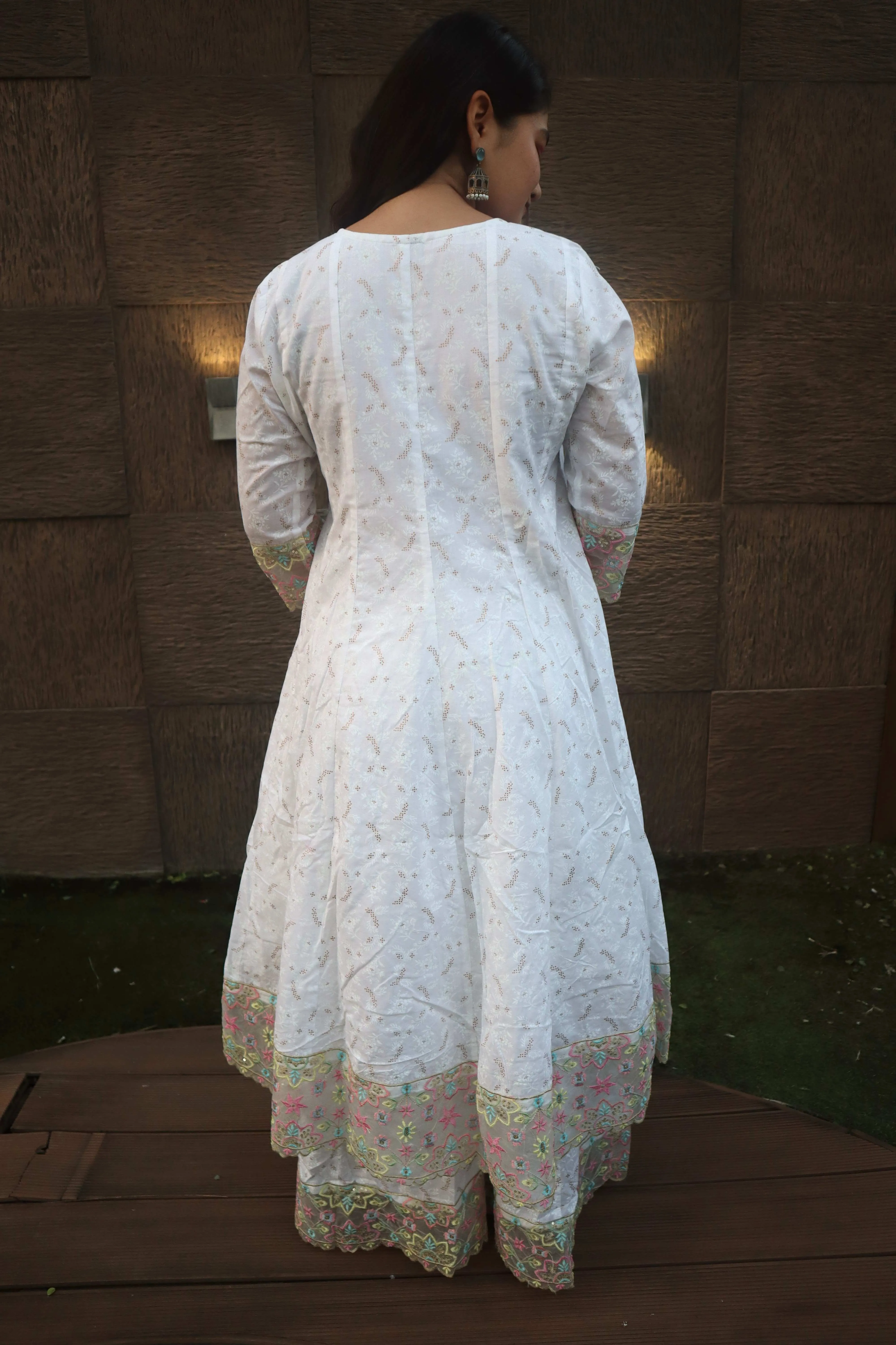 Material <p><strong>Kurta Fabric:</strong> Pure Georgette .</p><p><strong>Kurta Style:</strong> Kalidar.</p><p><strong>Lining Material:</strong> Shantoon or fine cotton.</p><p><strong>Embroidery Style:</strong> Hand-Embroidered Chikankari.</p><p><strong>Threadwork Color:</strong> Pastel Resham (multi-color).</p><p><strong>Embroidery Density:</strong> Heavy Jaal work.</p><p><strong>Dupatta Fabric:</strong> Sheer Chiffon/Net.</p><p><strong>Dupatta Finish:</strong> Scalloped border.</p><p><strong>Pants Fabric:</strong> Soft Silk Blend.</p>