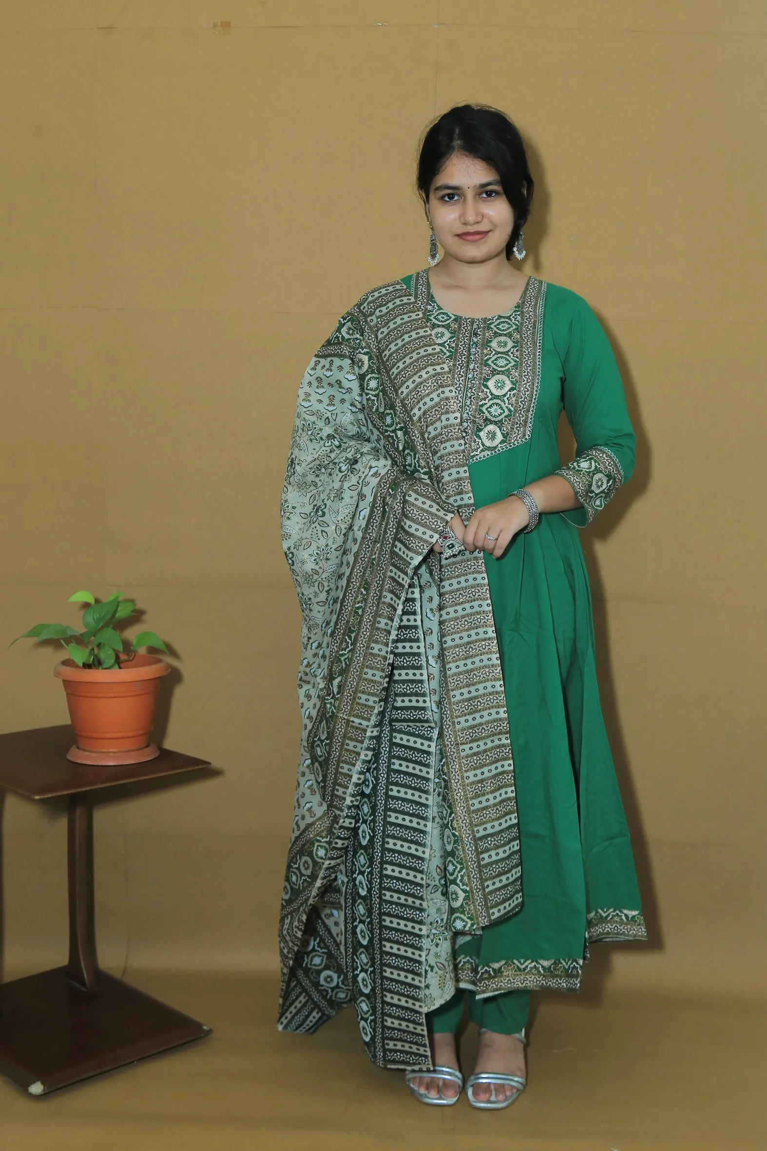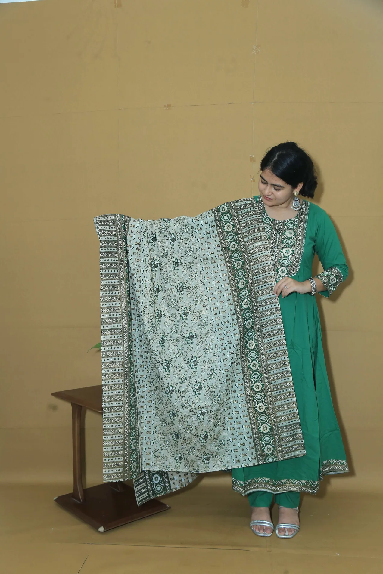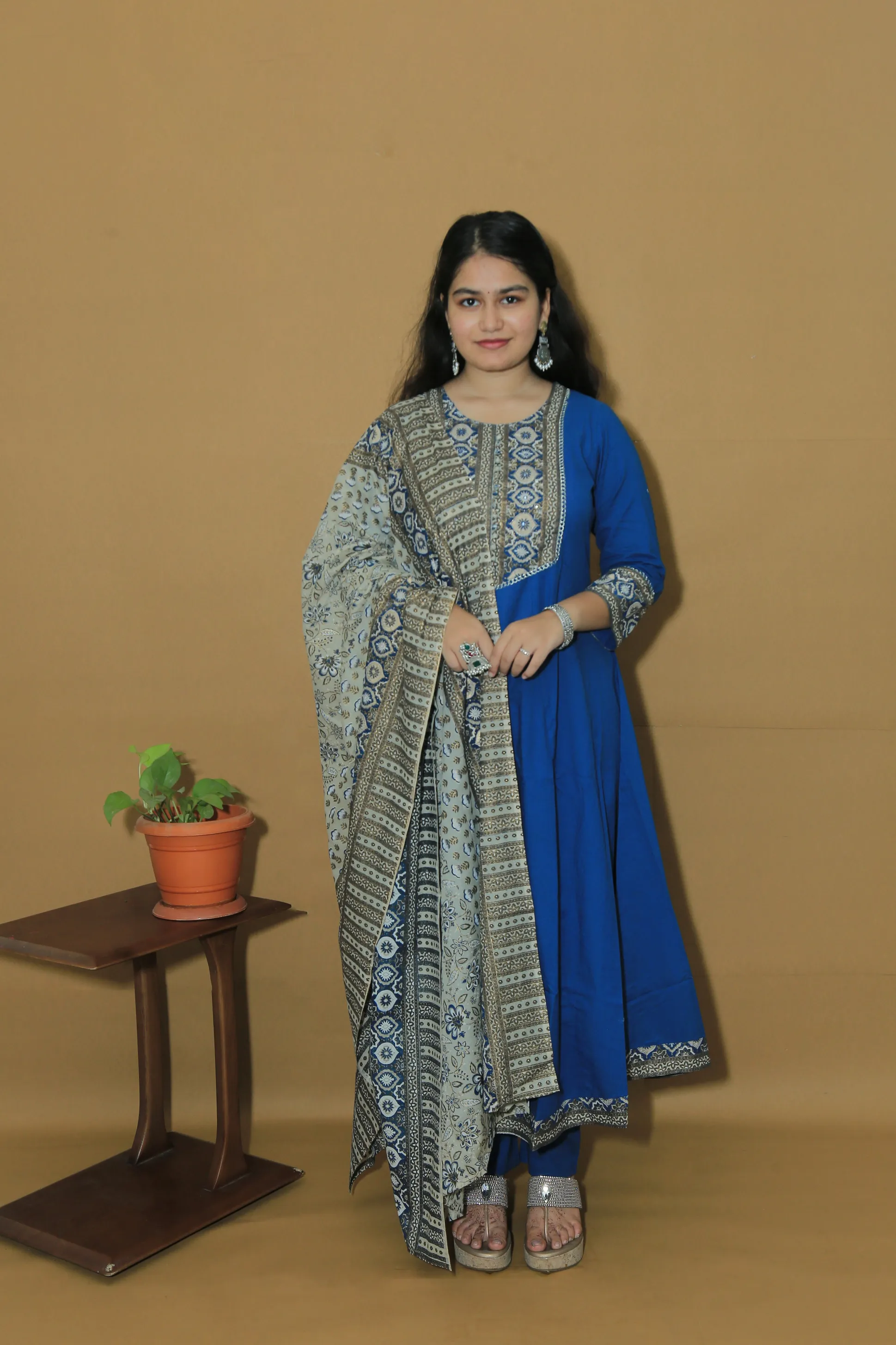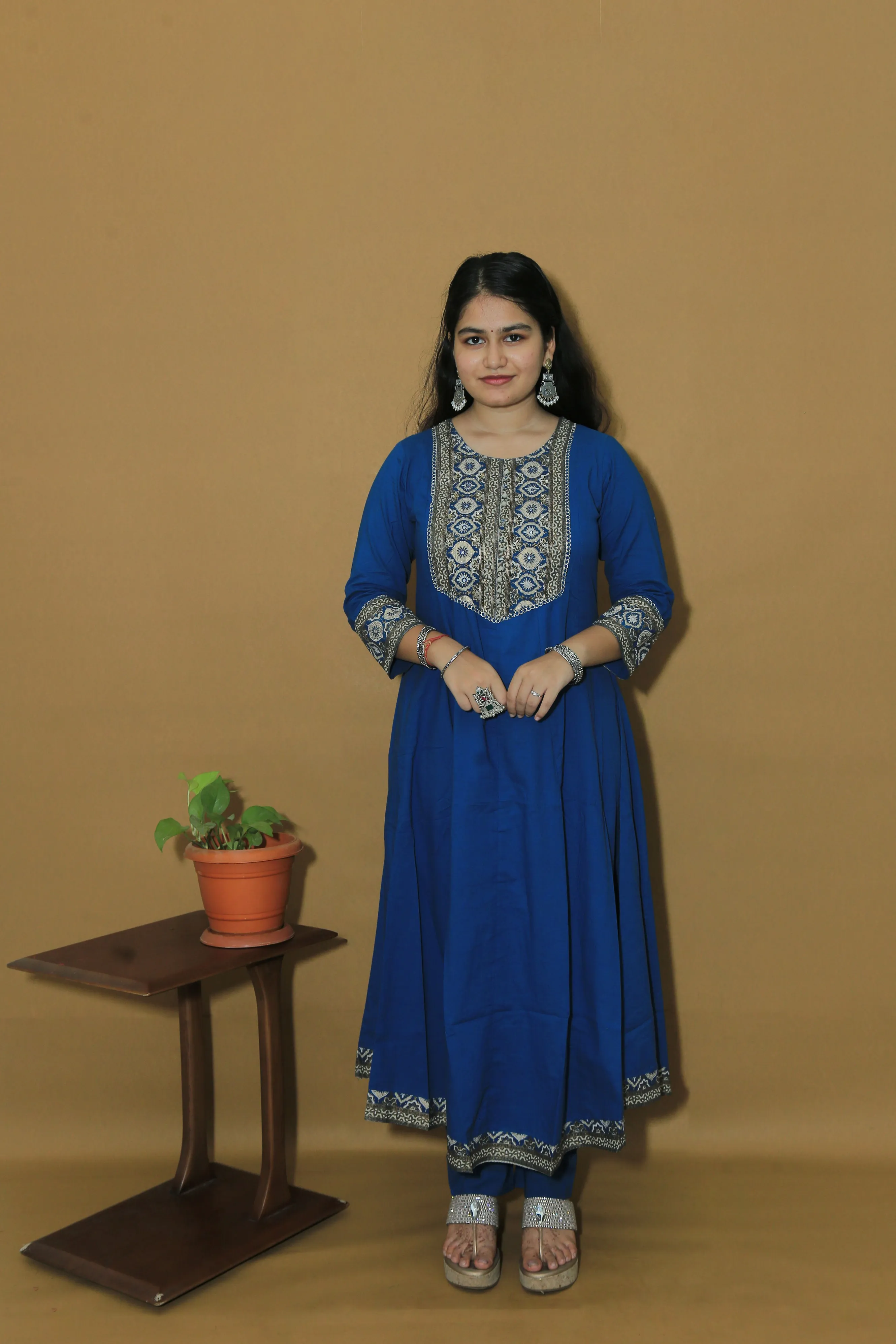 Material <p><strong>Vastra (Kurta &amp; Bottoms):</strong> Pure Cotton (Soft, breathable fabric for supreme comfort)</p><p><strong>Dopatta:</strong> Printed Cotton (Features rich, contrast traditional print)</p><p><strong>Work:</strong> Intricate Yoke Embellishment and Heritage-Inspired Print</p>