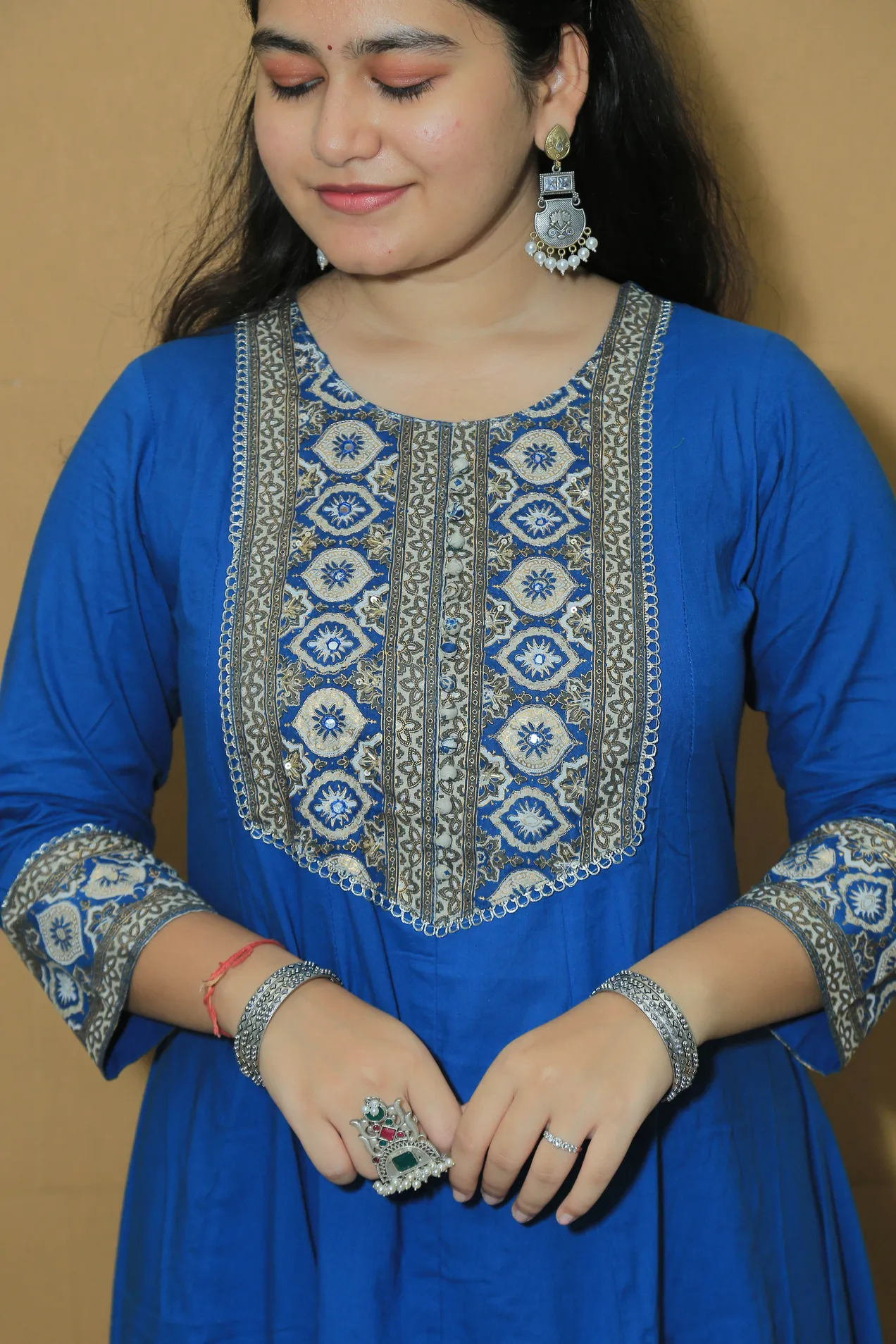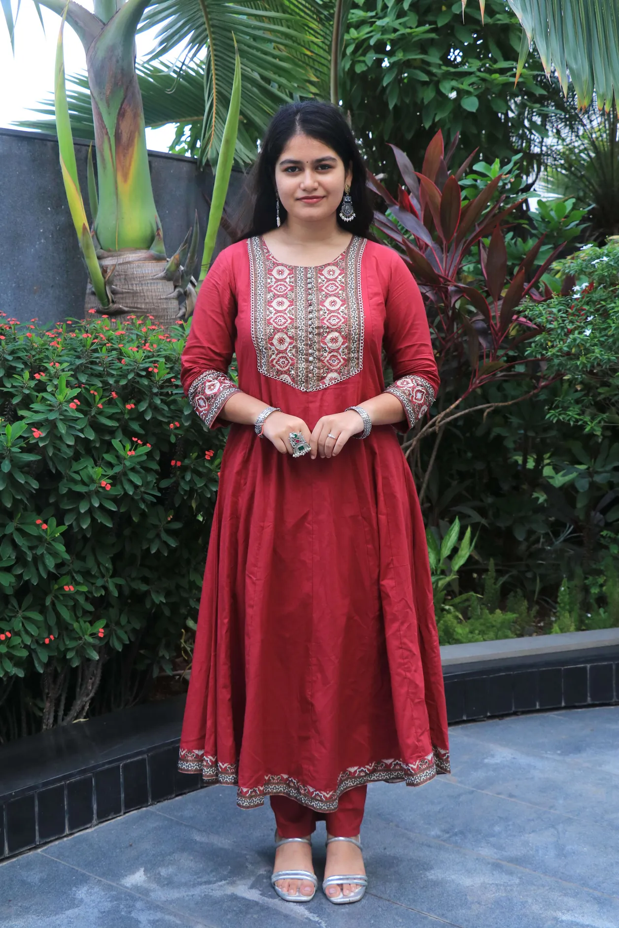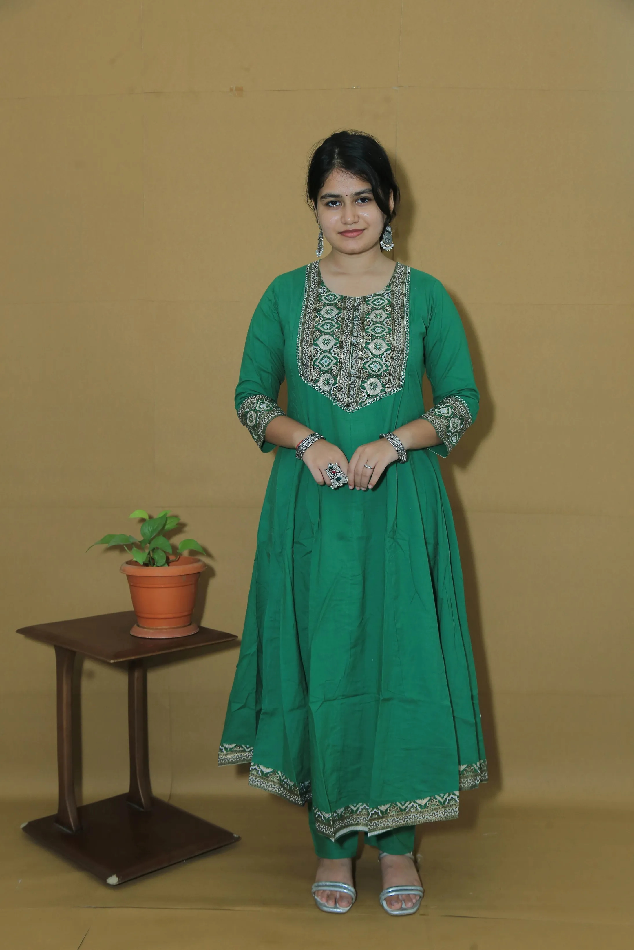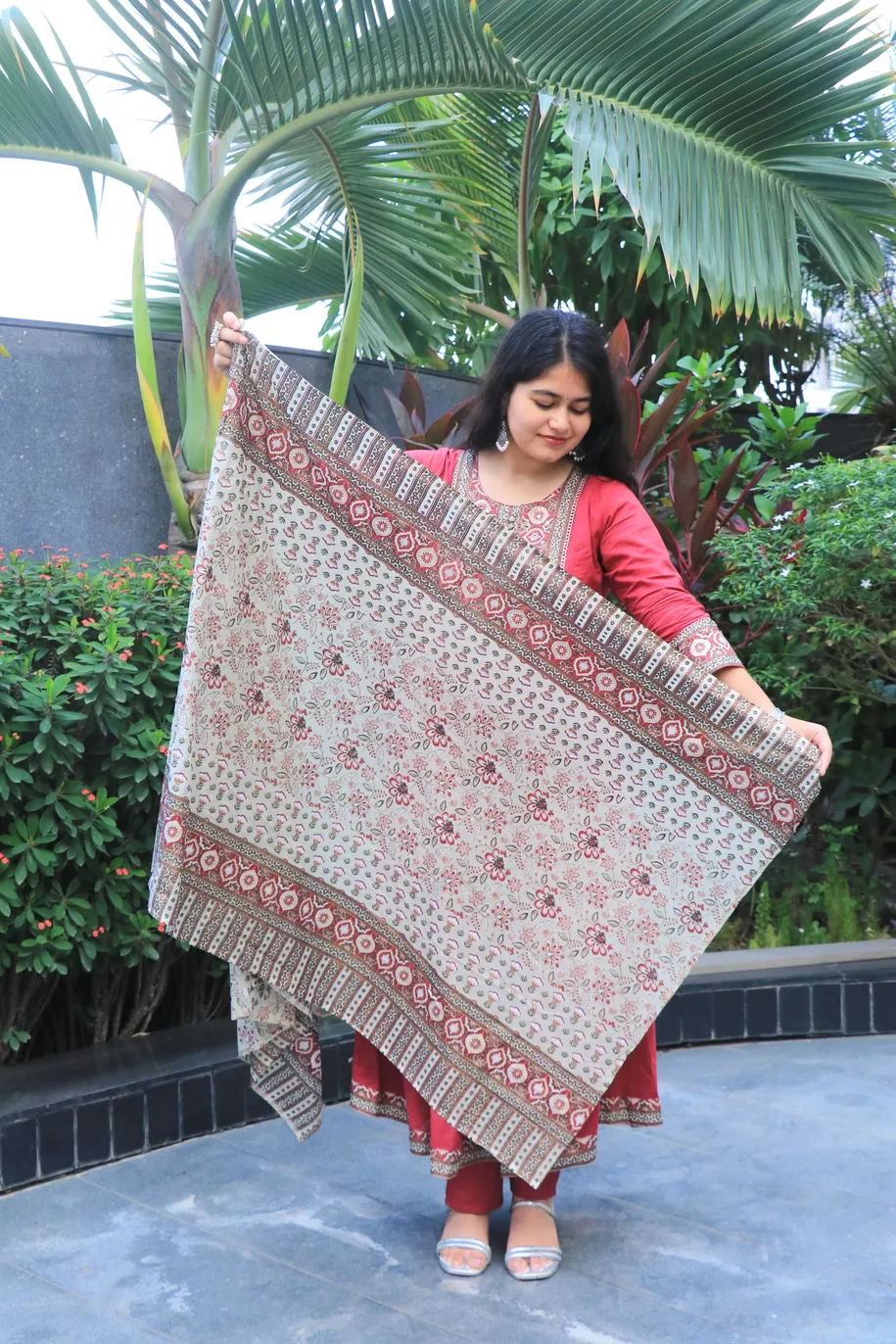 Material <p><strong>Vastra (Kurta &amp; Bottoms):</strong> Pure Cotton (Soft, breathable fabric for supreme comfort)</p><p><strong>Dopatta:</strong> Printed Cotton (Features rich, contrast traditional print)</p><p><strong>Work:</strong> Intricate Yoke Embellishment and Heritage-Inspired Print</p>