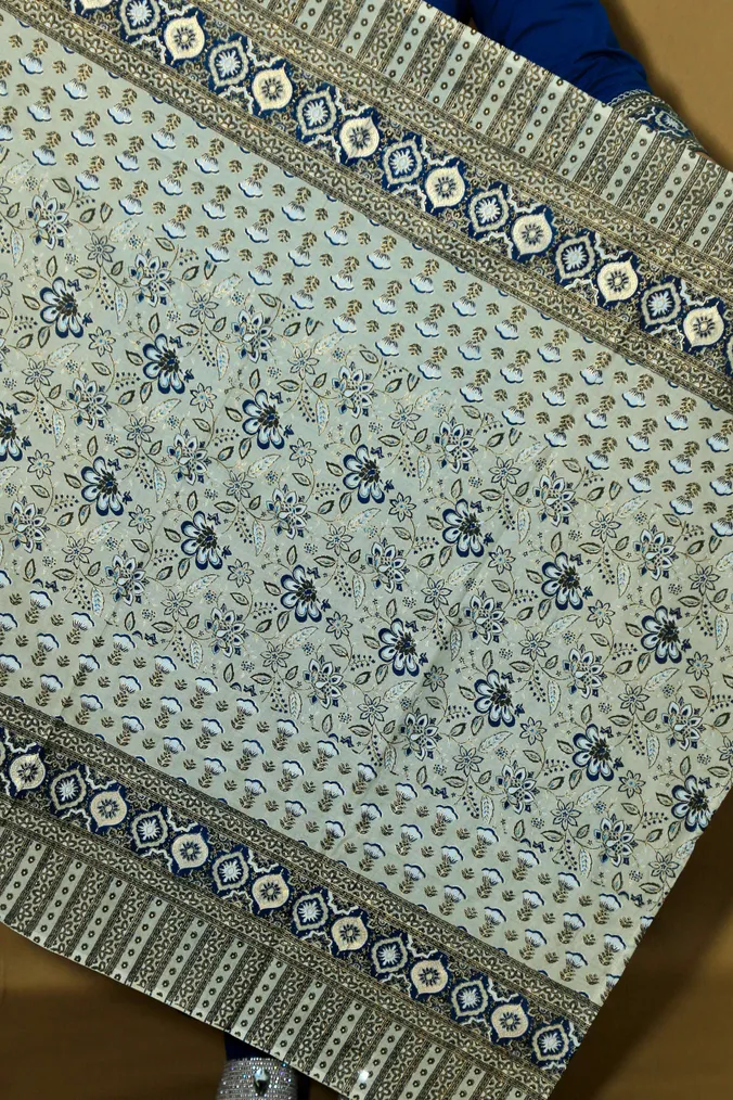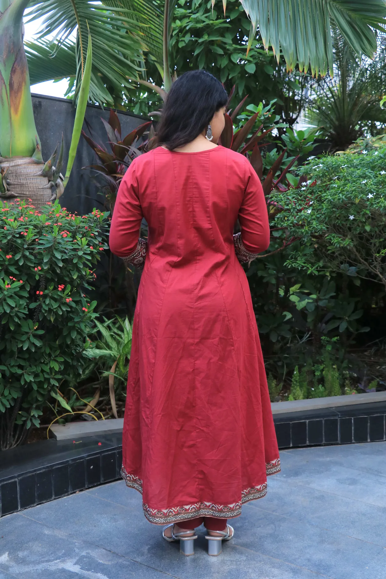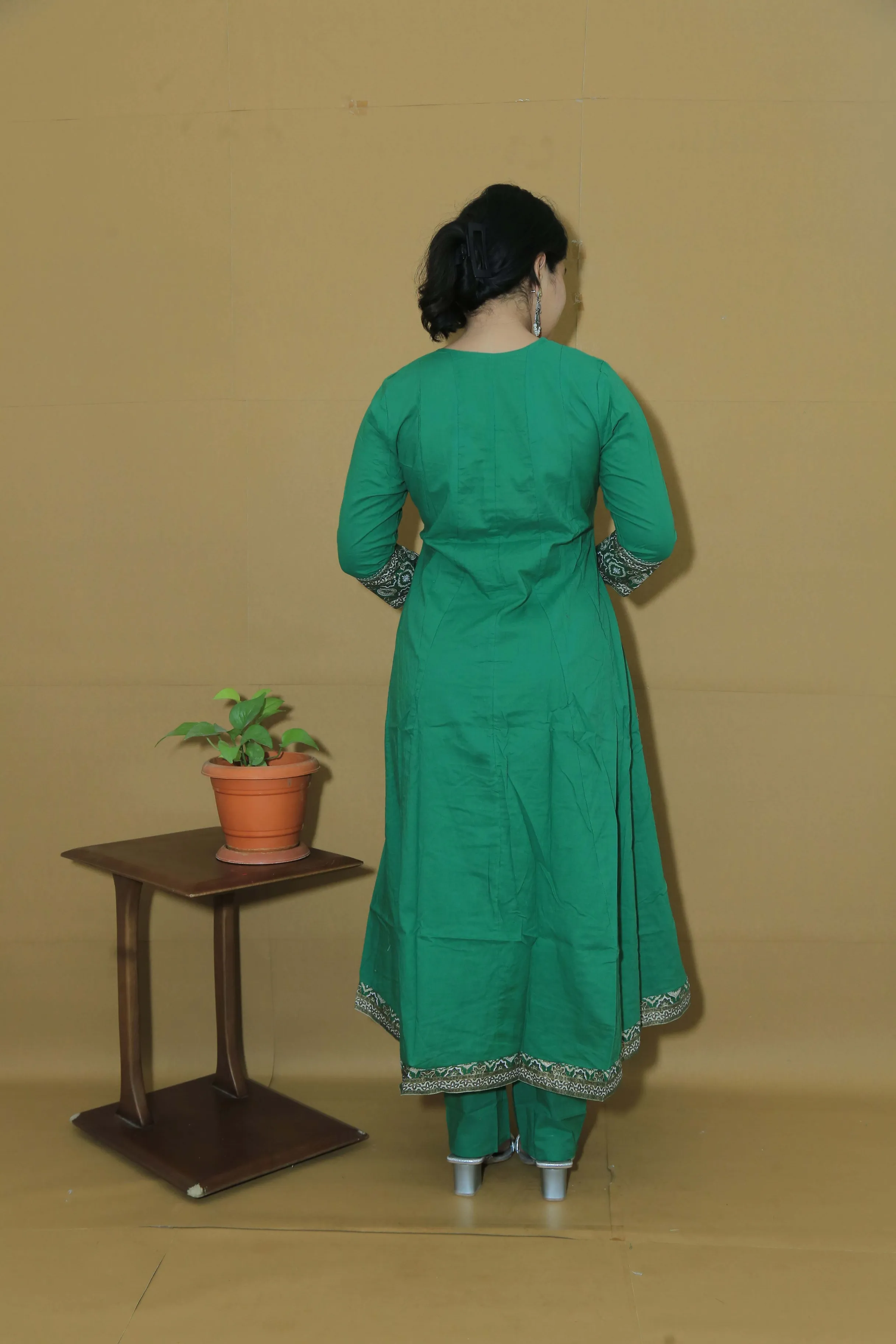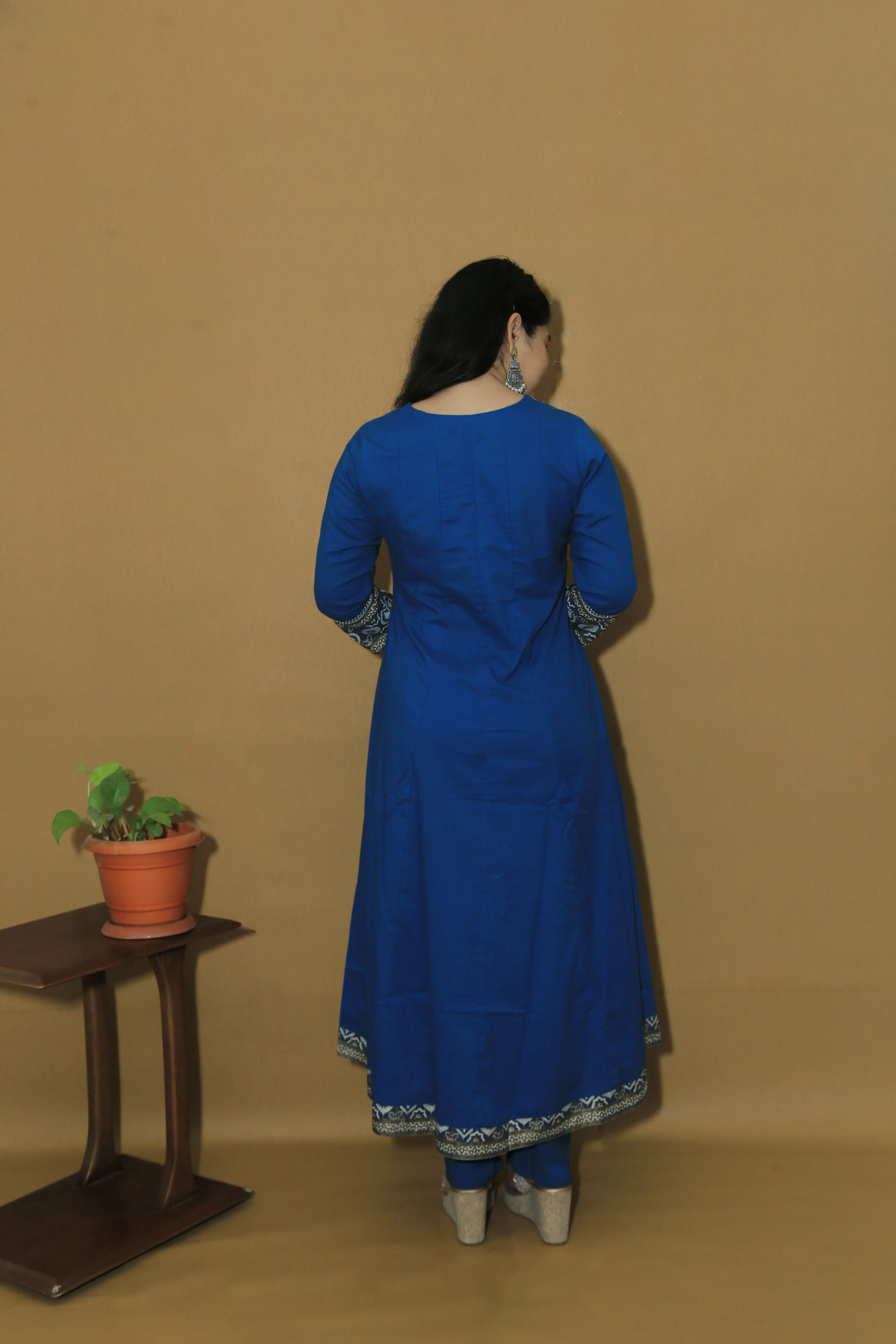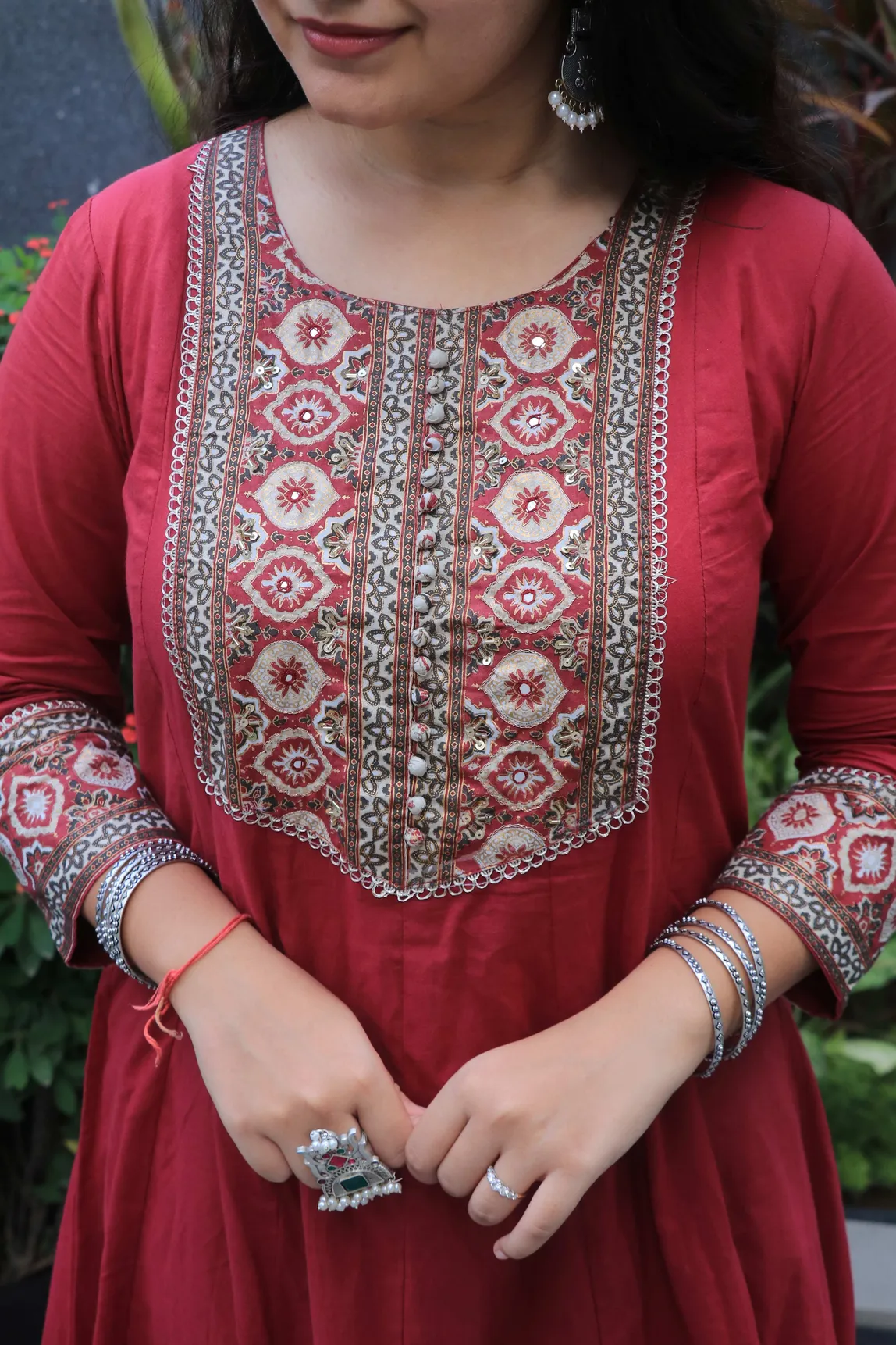 Material <p><strong>Vastra (Kurta &amp; Bottoms):</strong> Pure Cotton (Soft, breathable fabric for supreme comfort)</p><p><strong>Dopatta:</strong> Printed Cotton (Features rich, contrast traditional print)</p><p><strong>Work:</strong> Intricate Yoke Embellishment and Heritage-Inspired Print</p>