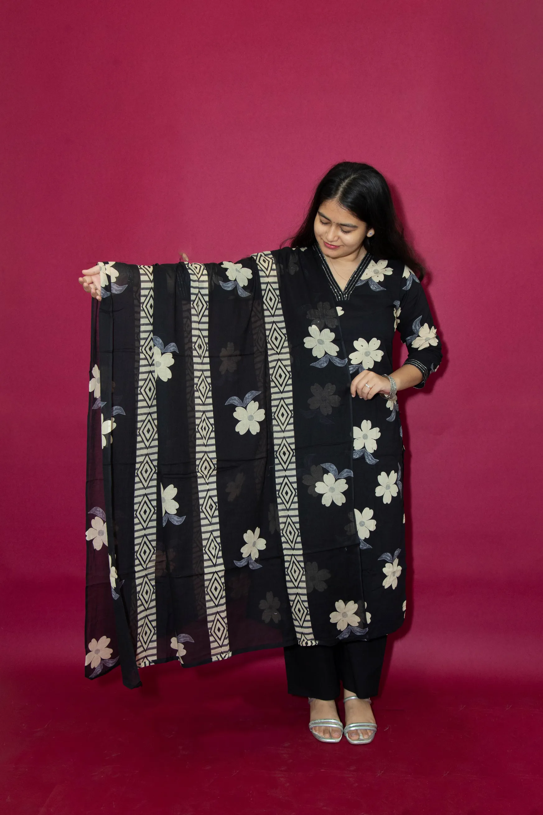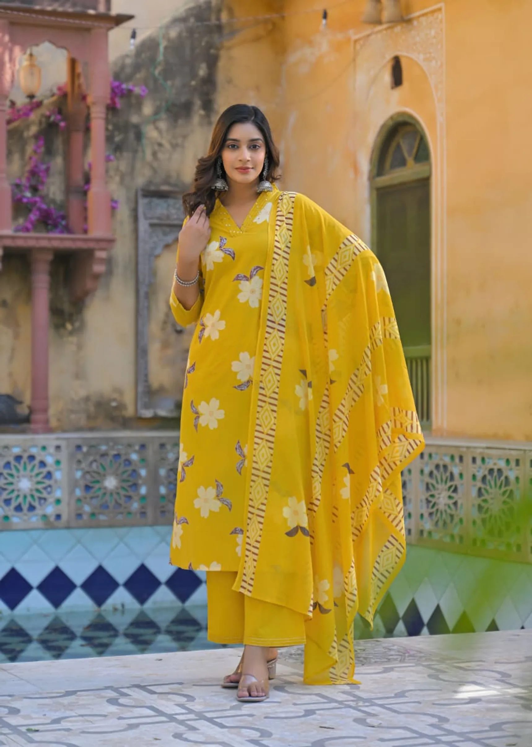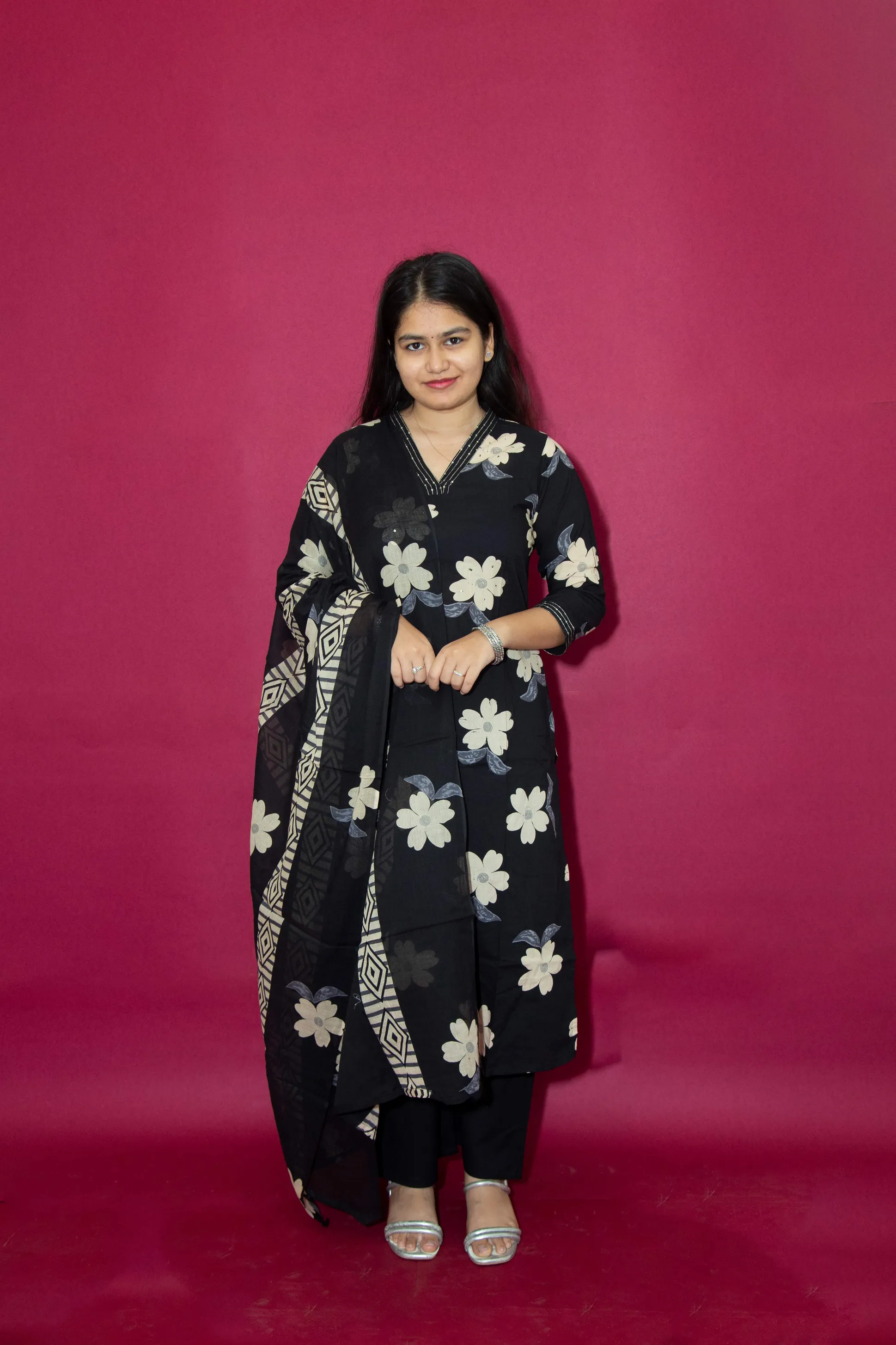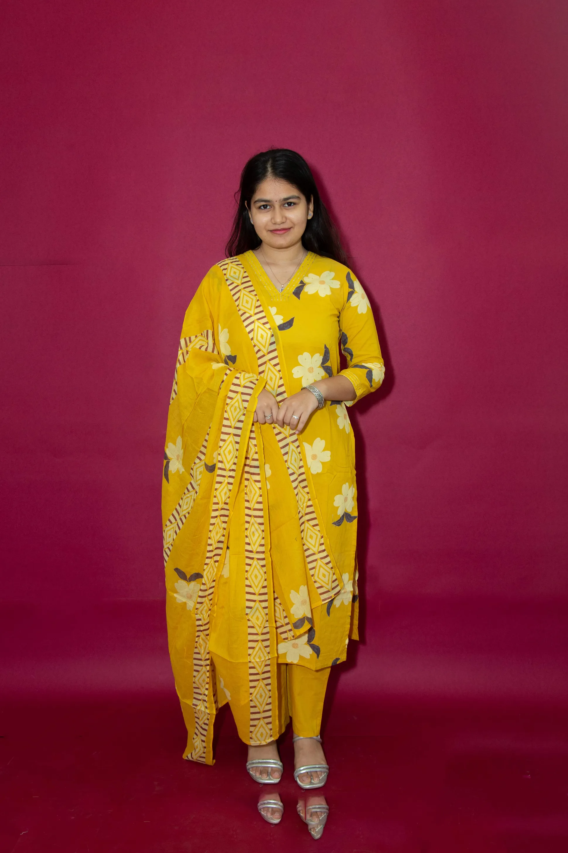 Material <p><strong>Fabric:</strong> Soft, breathable cotton blend.</p><p><strong>Work:</strong> Traditional floral print with subtle neckline embellishment.</p><p><strong>Fit:</strong> Straight cut, true to size.</p><p><strong>Includes:</strong> Kurta, Pant, and Dupatta.</p>