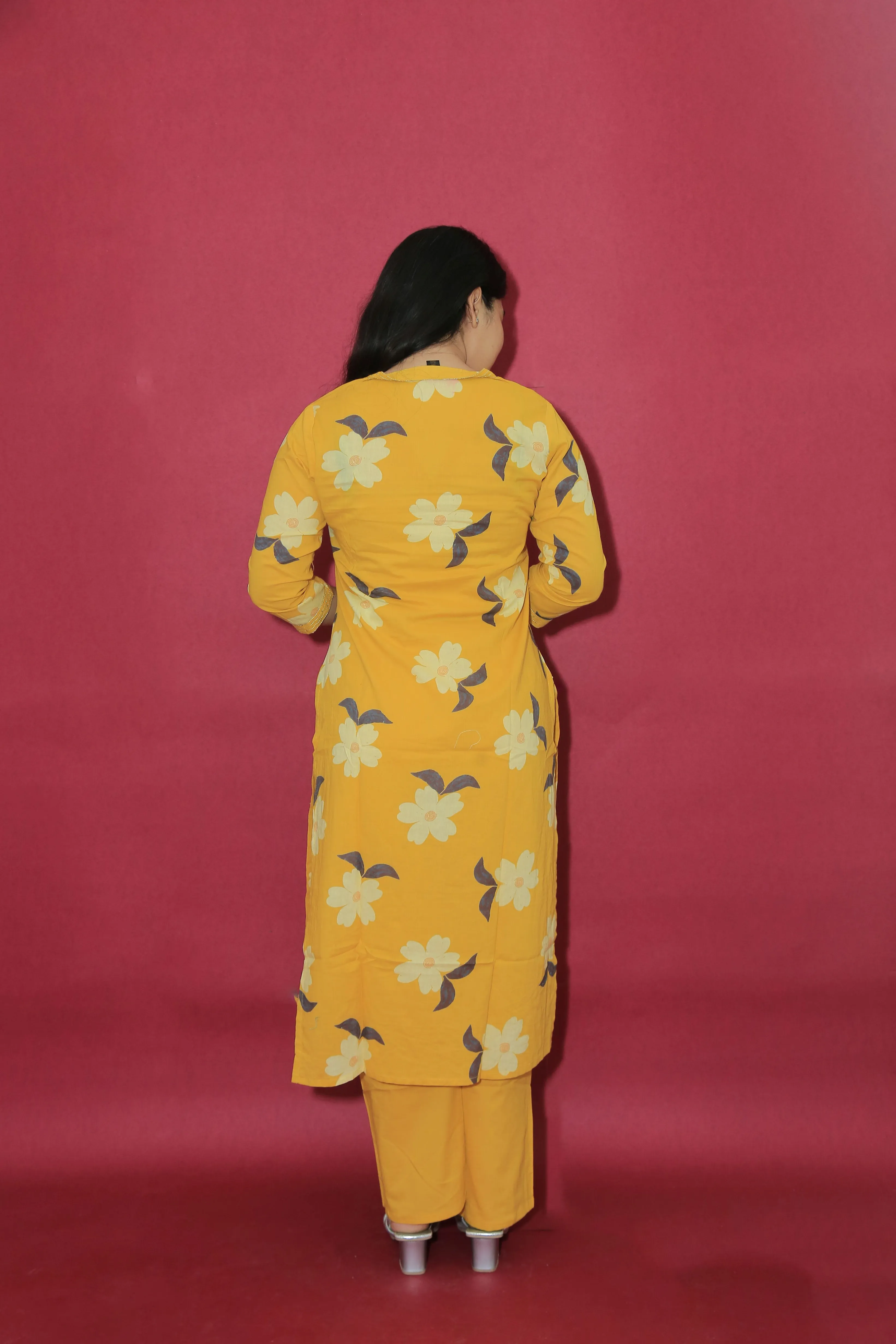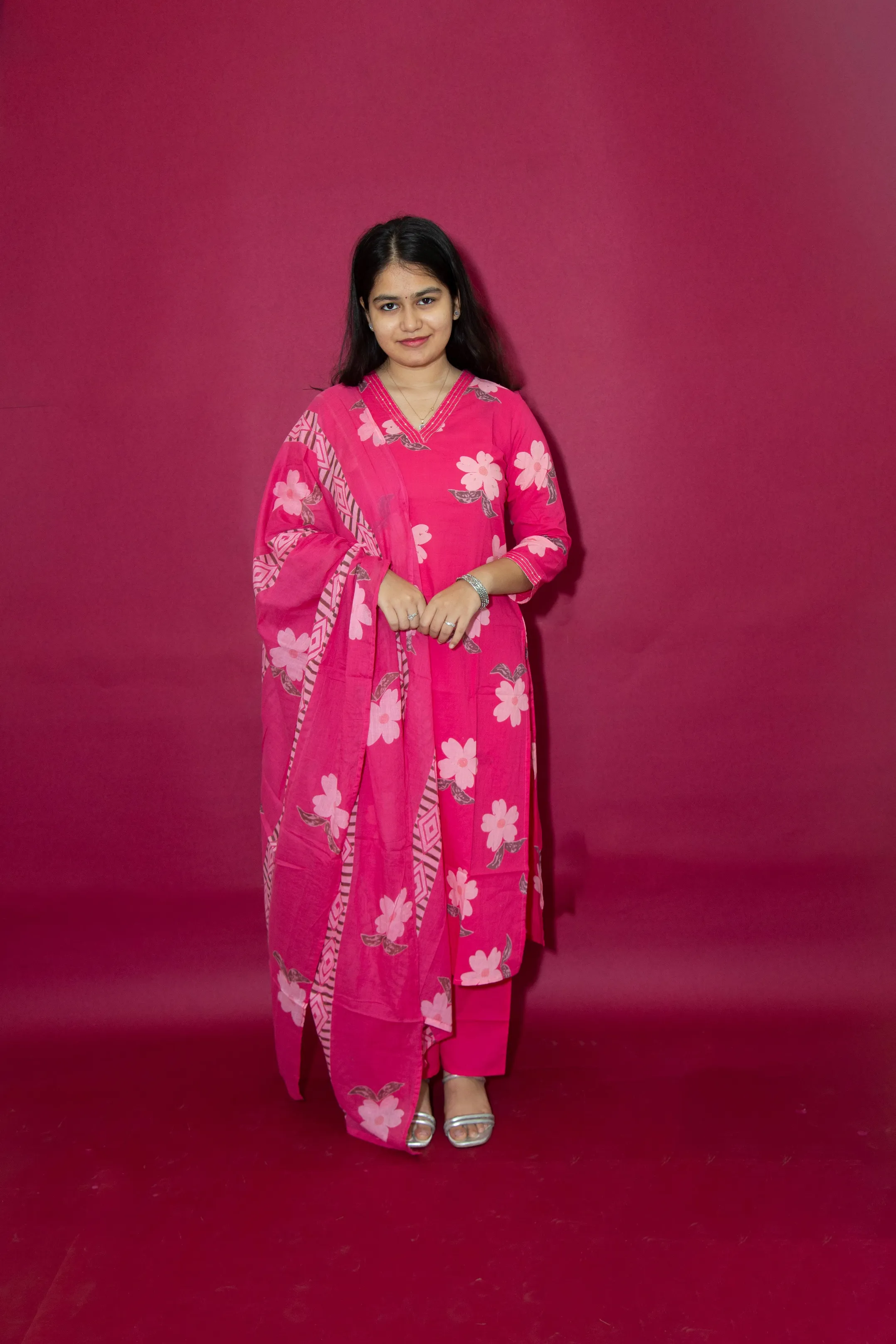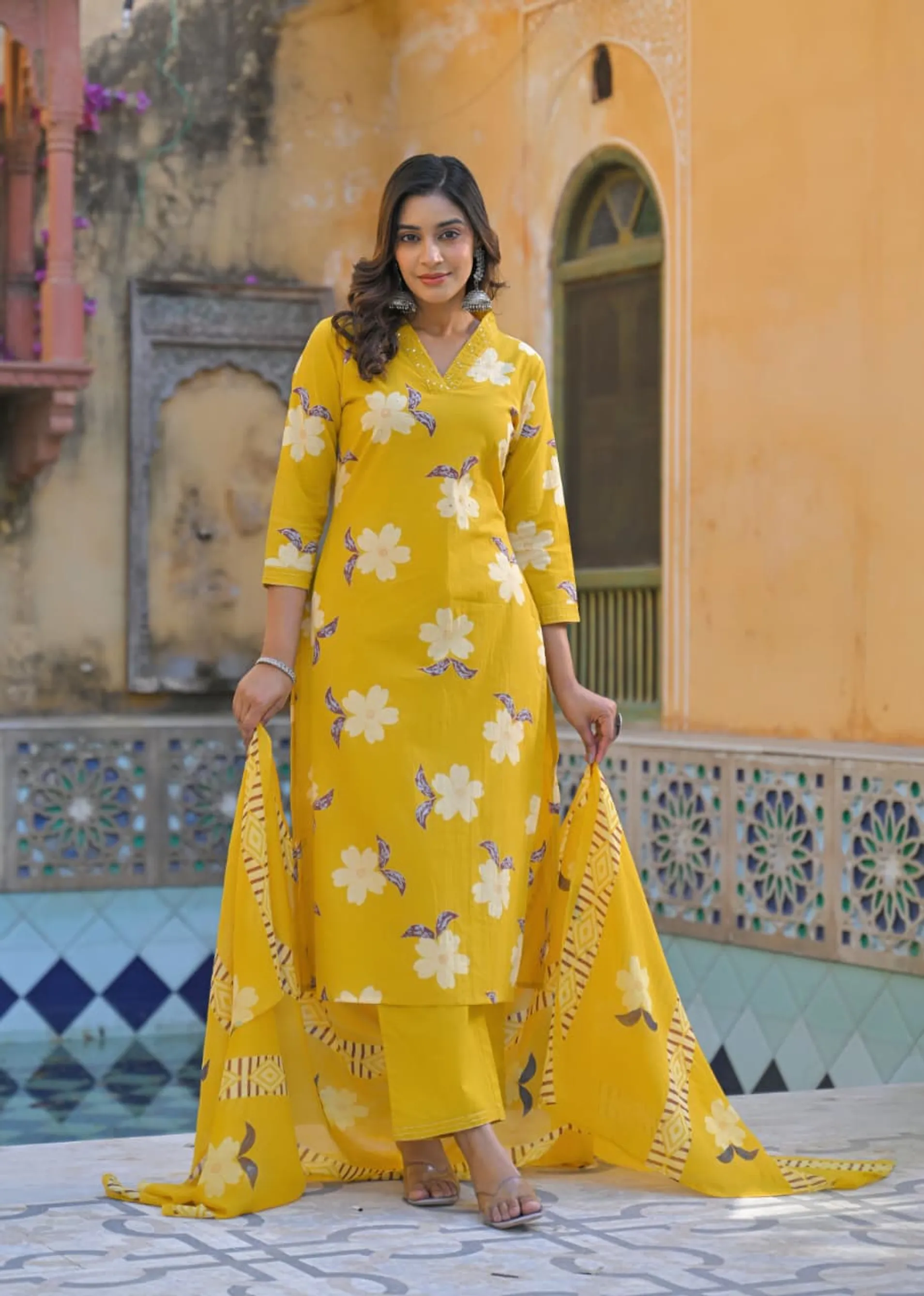 Material <p><strong>Fabric:</strong> Soft, breathable cotton blend.</p><p><strong>Work:</strong> Traditional floral print with subtle neckline embellishment.</p><p><strong>Fit:</strong> Straight cut, true to size.</p><p><strong>Includes:</strong> Kurta, Pant, and Dupatta.</p>