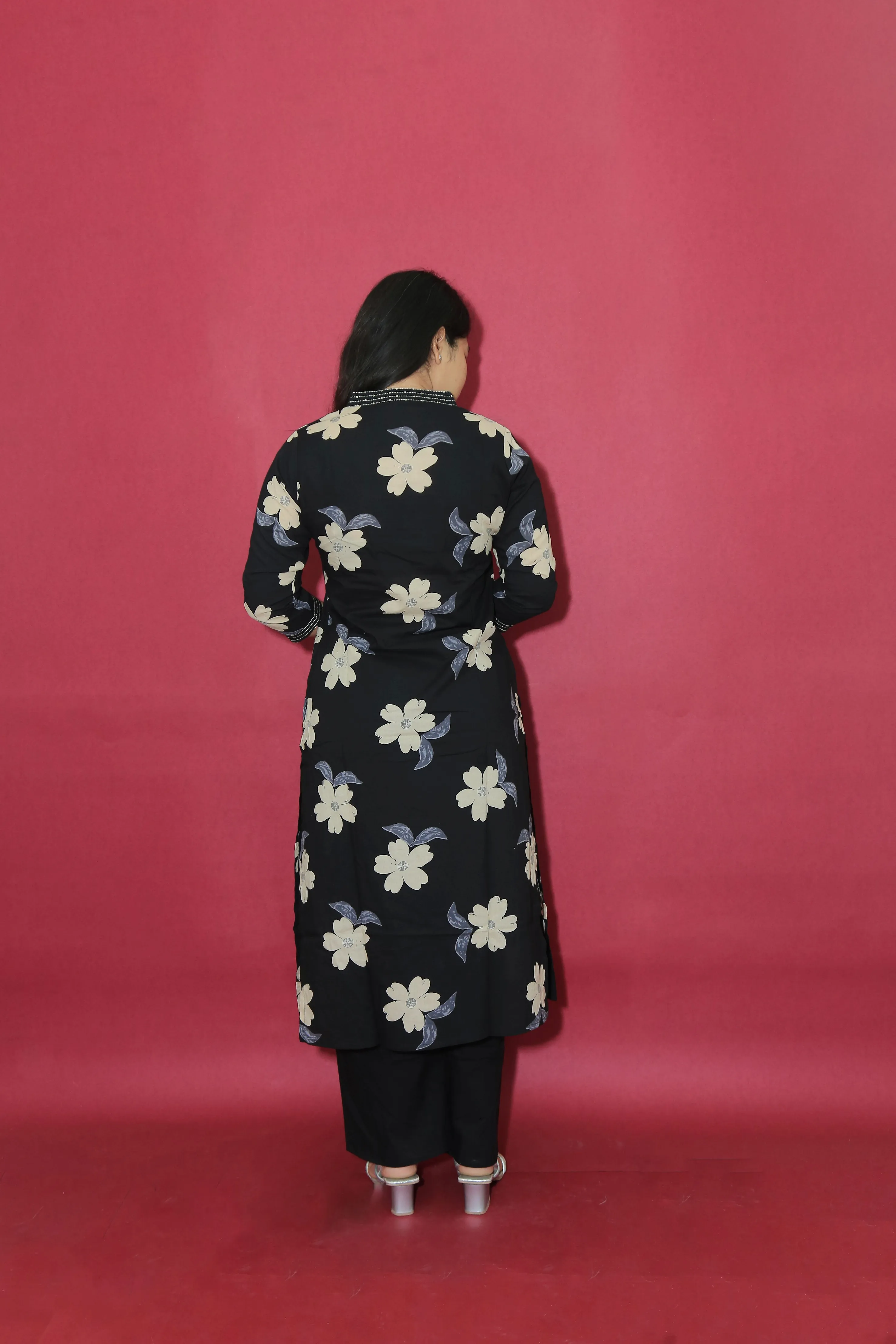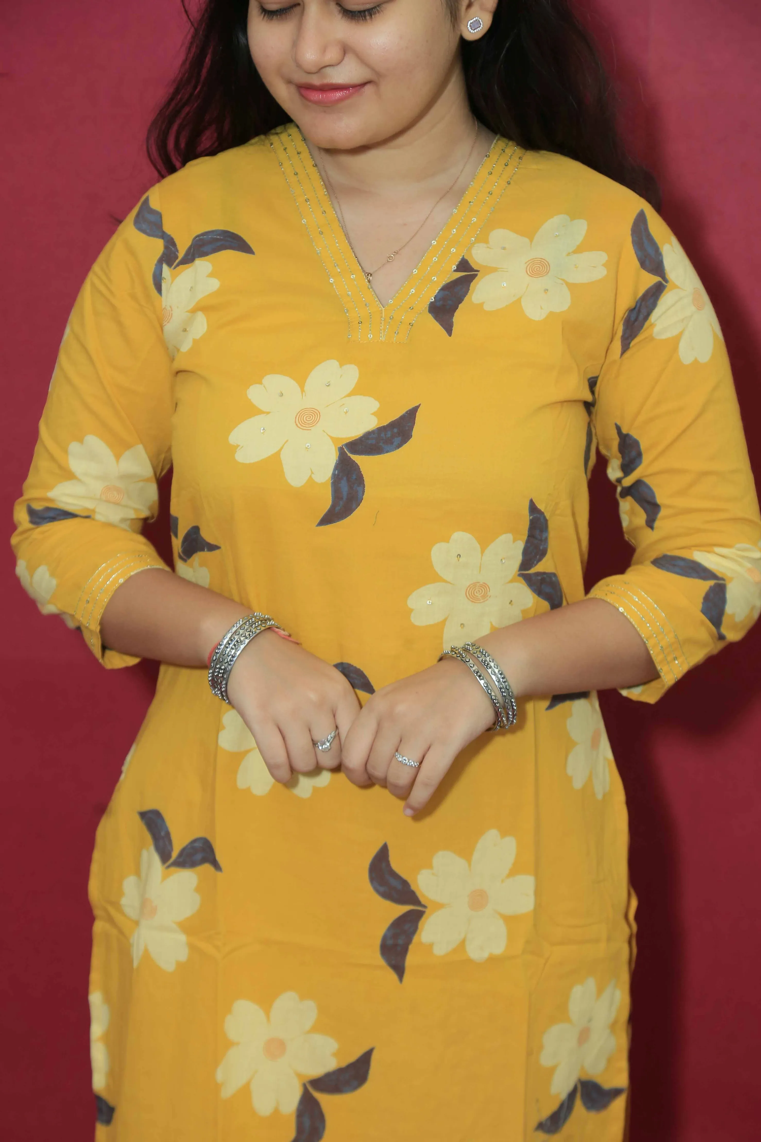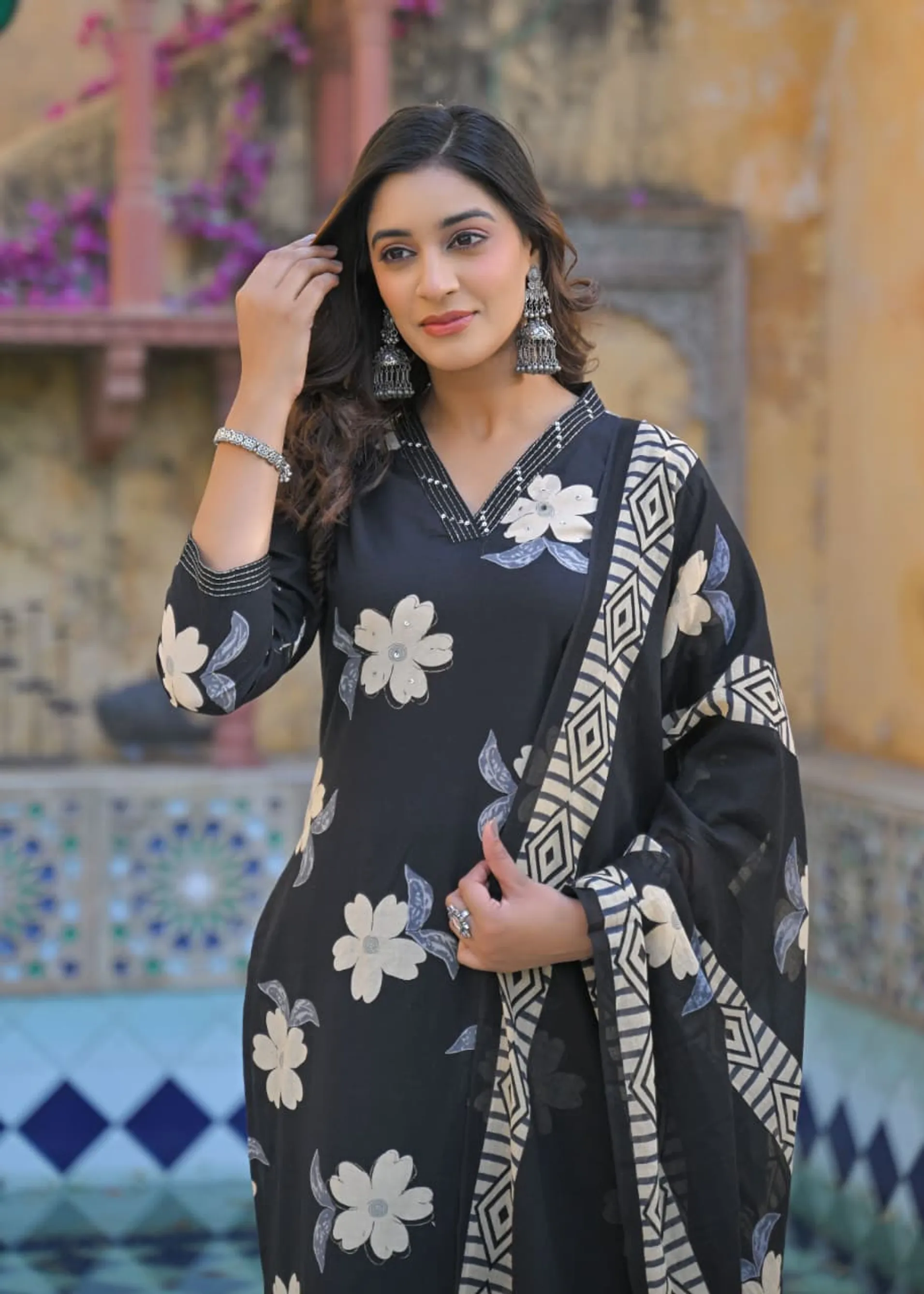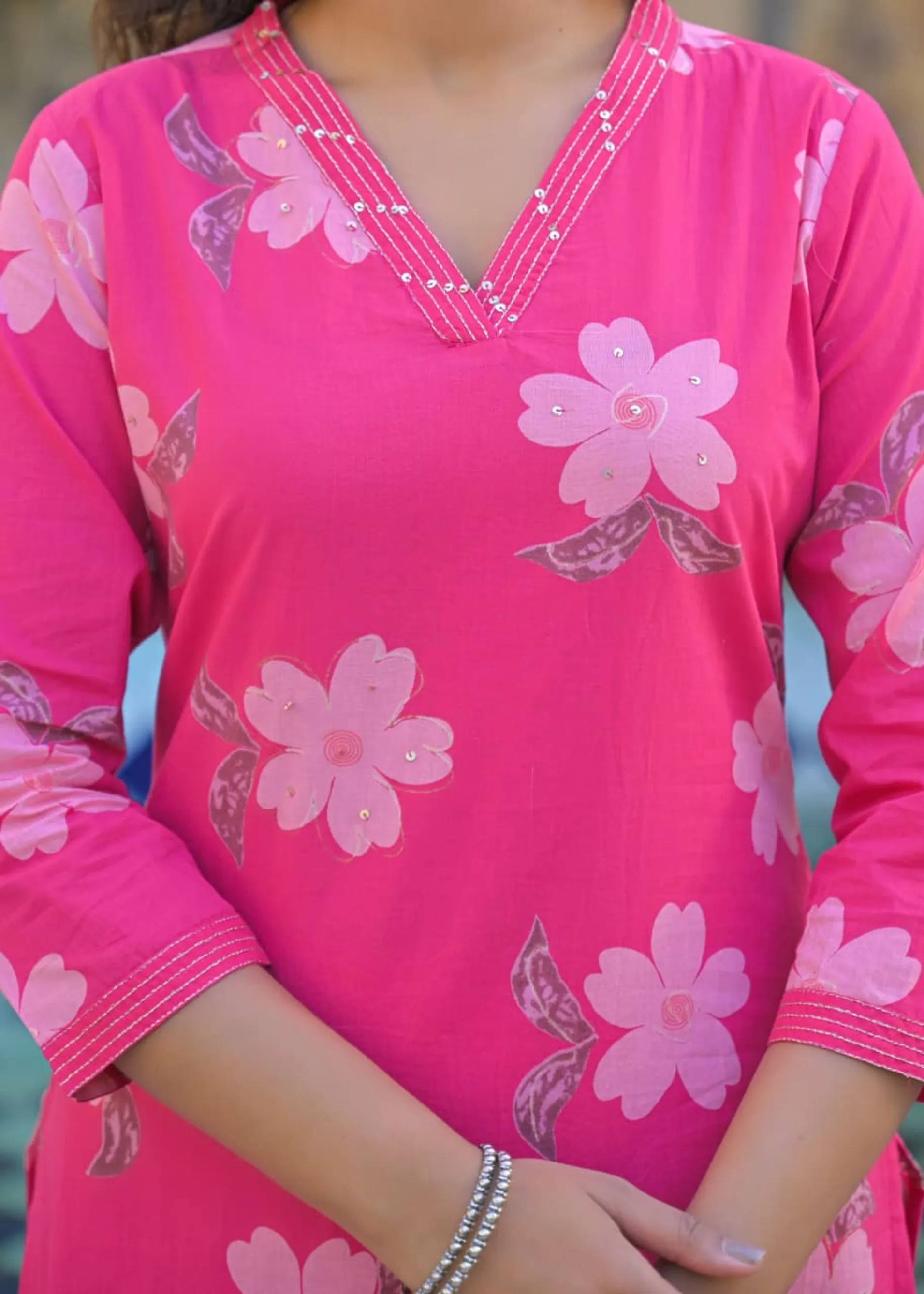 Material <p><strong>Fabric:</strong> Soft, breathable cotton blend.</p><p><strong>Work:</strong> Traditional floral print with subtle neckline embellishment.</p><p><strong>Fit:</strong> Straight cut, true to size.</p><p><strong>Includes:</strong> Kurta, Pant, and Dupatta.</p>